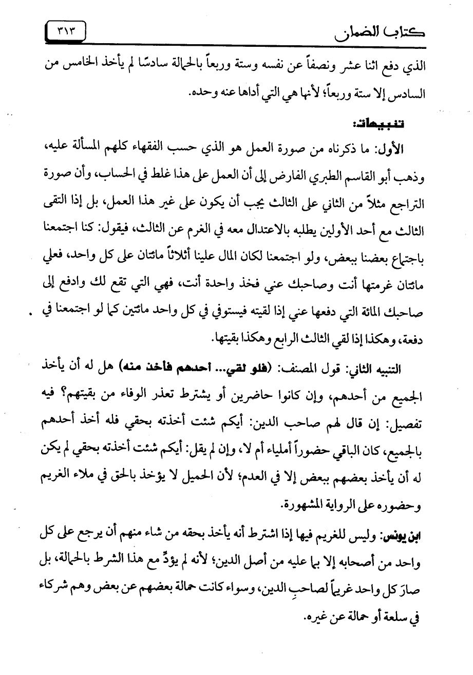 الأول: ما ذكرناه من صورة العمل هو الذي حسب الفقهاء كلهم المسألة عليه، وذهب أبو القاسم الطبري الفارض إلى أن العمل على هذا غلط في الحساب، وأن صورة التراجع مثلاً من الثاني على الثالث يجب أن يكون على غير هذا العمل، بل إذا التقى الثالث مع أحد الأولين يطلبه بالاعتدال معه في الغرم عن الثالث، فيقول: كنا اجتمعنا باجتماع بعضنا ببعض، ولو اجتمعنا لكان المال علينا أثلاثاً مائتان على كل واحد، فعلي مائتان غرمتها أنت وصاحبك عني فخذ واحدة أنت، فهي التي تقع لك وادفع إلى صاحبك المائة التي دفعها عني إذا لقيته فيستوفي في كل واحد مائتين كما لو اجتمعنا في دفعة، وهكذا إذا لقي الثالث الرابع وهكذا بقيتها.