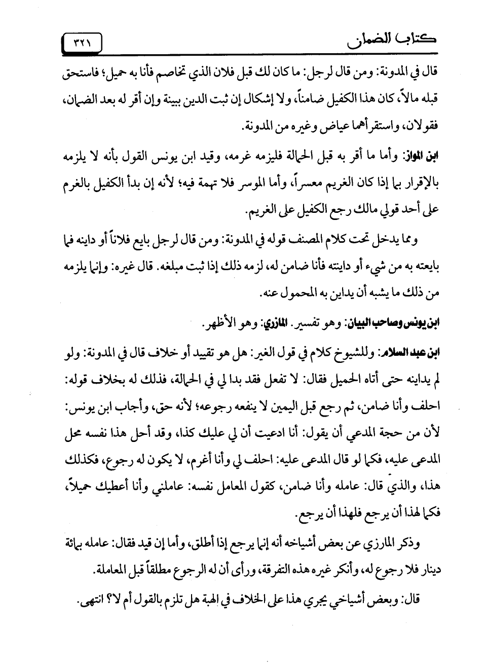 ابن عبد السلام: وللشيوخ كلام في قول الغير: هل هو تقييد أو خلاف قال في المدونة: ولو لم يداينه حتى أتاه الحميل فقال: لا تفعل فقد بد لي في الحمالة، فذلك له بخلاف قوله: احلف وأنا ضامن، ثم رجع قبل اليمين لا ينفعه رجوعه؛ لأنه حق، وأجاب ابن يونس: لأن من حجة المدعي أن يقول: أنا ادعيت أن لي عليك كذا، وقد أحل هذا نفسه محل المدعى عليه، فكما لو قال المدعى عليه: احلف لي وأنا أغرم، لا يكون له رجوع، فكذلك هذا، والذي قال: عامله وأنا ضامن، كقول المعامل نفسه: عاملني وأنا أعطيك حميلاً، فكما لهذا أن يرجع فلهذا أن يرجع.