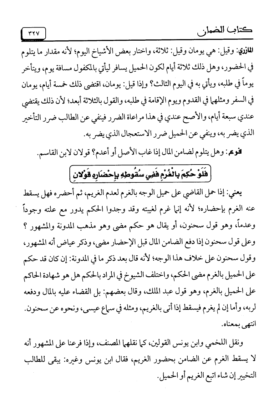 المازري: وقيل: هي يومان وقيل: ثلاثة، واختار بعض الأشياخ اليوم؛ لأنه مقدار ما يتلوم في الحضور، وهل ذلك ثلاثة أيام لكون الحميل يسافر ليأتي بالمكفول مسافة يوم، ويتأخر يوماً في طلبه، ويأتي به في اليوم الثالث؟ وإذا قيل: يومان، اقتضى ذلك خمسة أيام، يومان في السفر ومثلهما في القدوم ويوم الإقامة في طلبه، والقول بالثلاثة أبعد؛ لأن ذلك يقتضي عندي سبعة أيام، والأصح عندي في هذا مراعاة الضرر فينفي عن الطالب ضرر التأخير الذي يضر به، وينفي عن الحميل ضرر الاستعجال الذي يضر به.