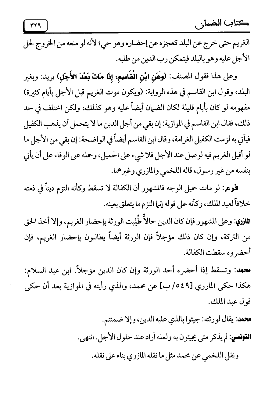 المازري: وعلى المشهور فإن كان الدين حالاًّ طُلِبت الورثة بإحضار الغريم، وإلا أخذ الحق من التركة، وإن كان ذلك مؤجلاً فإن الورثة أيضاً يطالبون بإحضار الغريم، فإن أحضروه سقطت الكفالة.