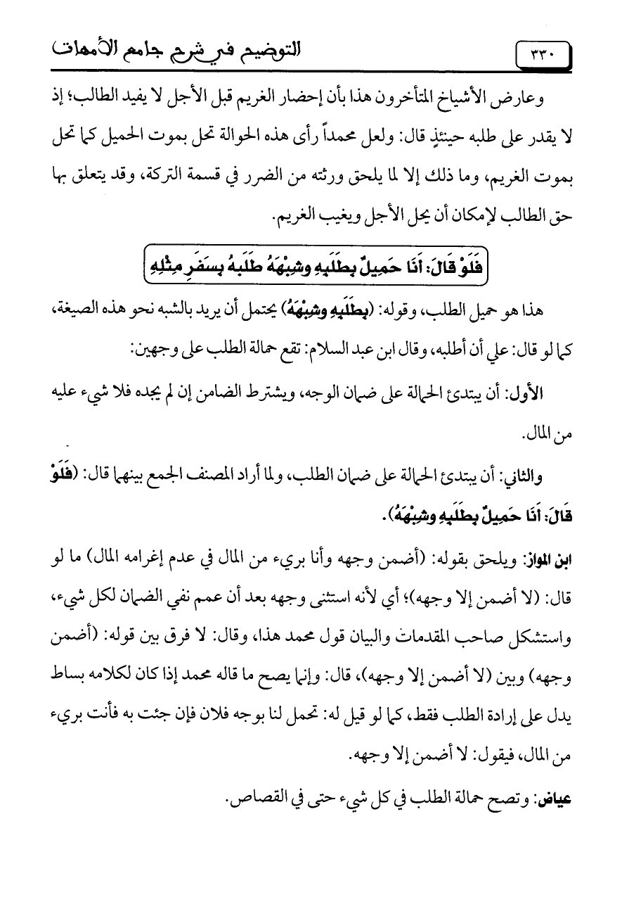 ابن المواز: ويلحق بقوله: (أضمن وجهه وأنا بريء من المال في عدم إغرامه المال) ما لو قال: (لا أضمن إلا وجهه)؛ أي لأنه استثنى وجهه بعد أن عمم نفي الضمان لكل شيء، واستشكل صاحب المقدمات والبيان قول محمد هذا، وقال: لا فرق بين قوله: (أضمن وجهه) وبين (لا أضمن إلا وجهه)، قال: وإنما يصح ما قاله محمد إذا كان لكلامه بساط يدل على إرادة الطلب فقط، كما لو قيل له: تحمل لنا بوجه فلان فإن جئت به فأنت بريء من المال، فيقول: لا أضمن إلا وجهه.