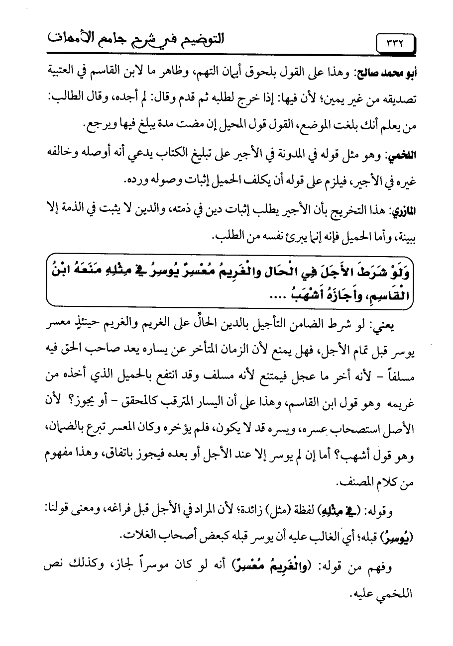 وَلَوْ شَرَطَ الأَجَلَ فِي الْحَال والْغَرِيمُ مُعْسِرٌ يُوسِرُ في مِثْلِهِ مَنَعَهُ ابْنُ الْقَاسِمِ، وأَجَازَهُ أَشْهَبُ ....