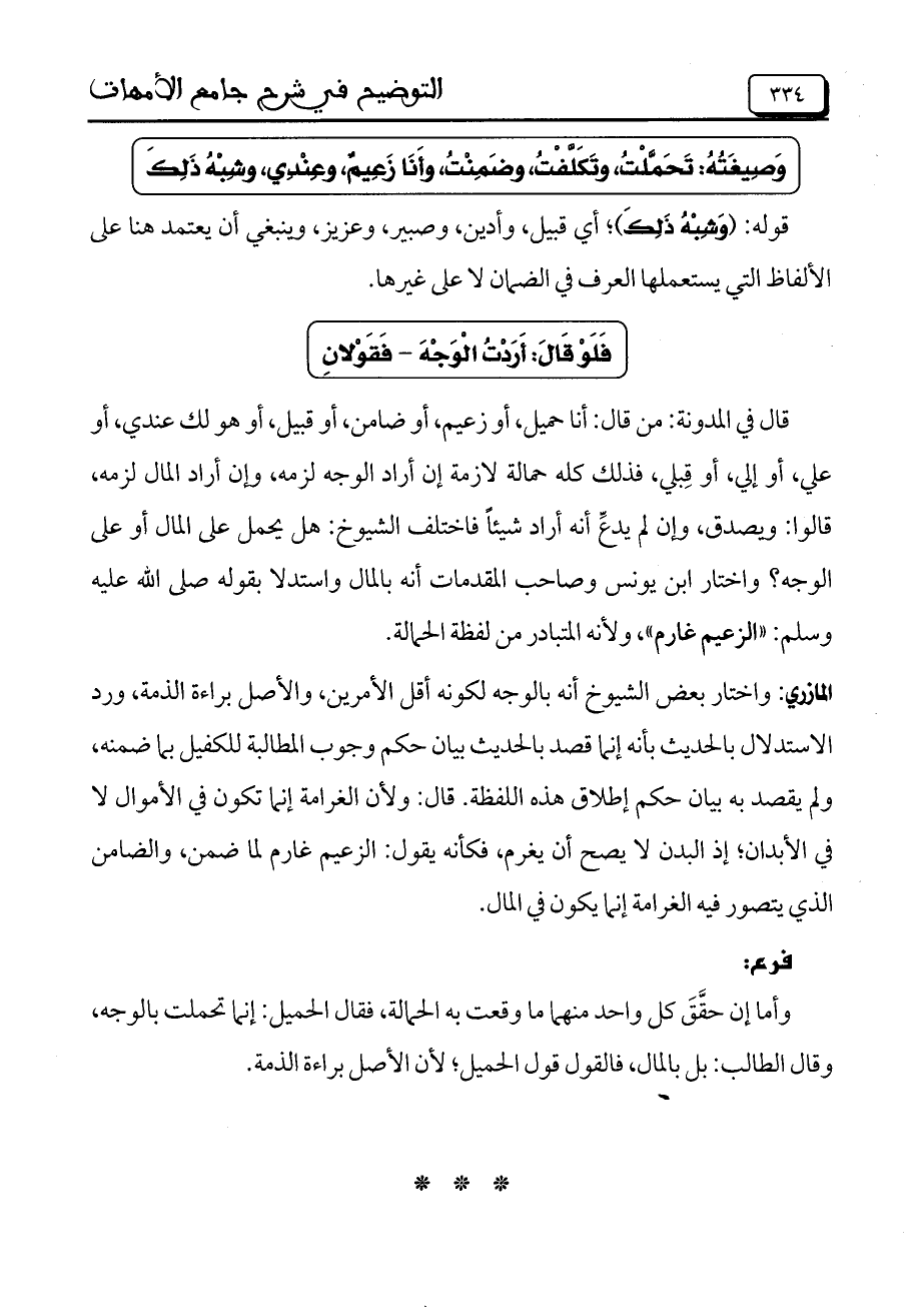 المازري: واختار بعض الشيوخ أنه بالوجه لكونه أقل الأمرين، والأصل براءة الذمة، ورد الاستدلال بالحديث بأنه إنما قصد بالحديث بيان حكم وجوب المطالبة للكفيل بما ضمنه، ولم يقصد به بيان حكم إطلاق هذه اللفظة. قال: ولأن الغرامة إنما تكون في الأموال لا في الأبدان؛ إذ البدن لا يصح أن يغرم، فكأنه يقول: الزعيم غارم لما ضمن، والضامن الذي يتصور فيه الغرامة إنما يكون في المال.