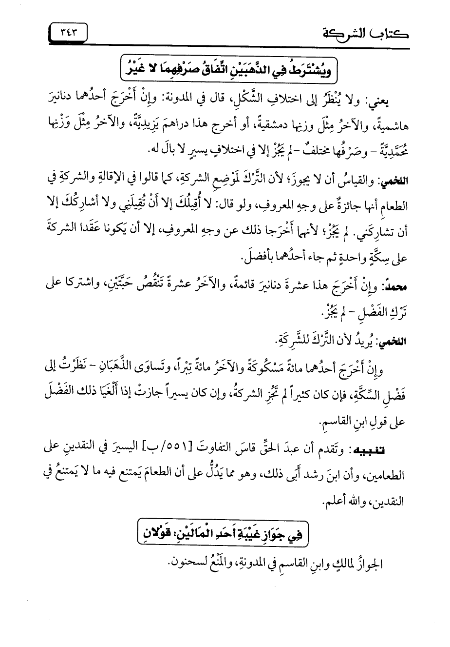 اللخمي: والقياس أن لا يجوز؛ لأن الترك لموضع الشركة، كما قالوا في الإقالة والشركة في الطعام أنها جائزة على وجه المعروف، ولو قال: لا أقيلك إلا أن تقيلني ولا أشاركك إلا أن تشاركني. لم يجز؛ لأنهما أخرجا ذلك عن وجه المعروف، إلا أن يكونا عقدا الشركة على سكة واحدة ثم جاء أحدهما بأفضل.