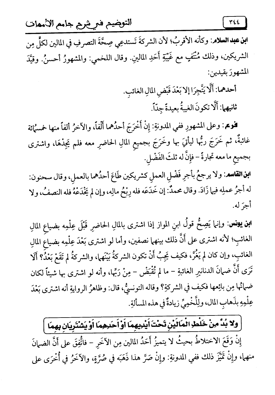 ابن عبد السلام: وكأنه الأقرب؛ لأن الشركة تستدعي صحة التصرف في المالين لكل من الشريكين، وذلك منتف مع غيبة أحد المالين. وقال اللخمي: والمشهور أحسن. وقيد المشهور بقيدين: