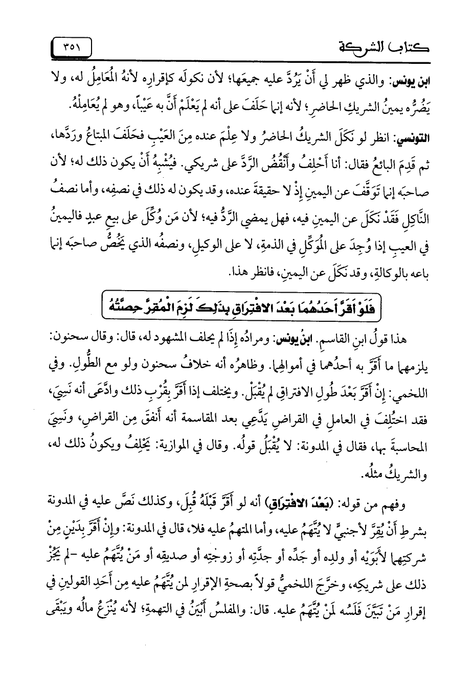 ابن يونس: والذي ظهر لي أن يرد عليه جميعها؛ لأن نكوله كإقراره لأنه المعامل له، ولا يضره يمين الشريك الحاضر؛ لأنه إنما حلف على أنه لم يعلم أن به عيباً، وهو لم يعامله.
