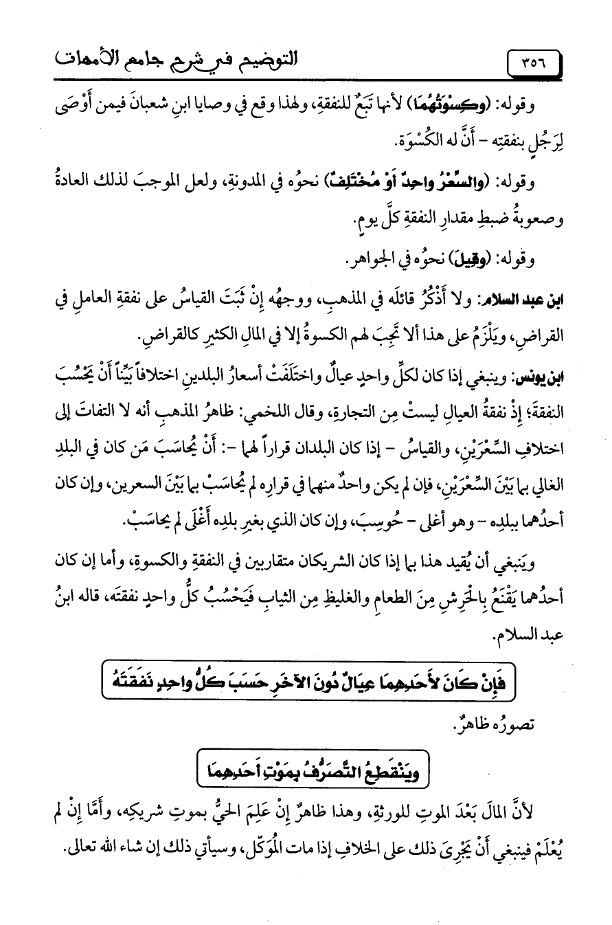 ابن عبد السلام: ولا أذكر قائله في المذهب، ووجهه إن ثبت القياس على نفقة العامل في القراض، ويلزم على هذا ألا تجب لهم الكسوة إلا في المال الكثير كالقراض.