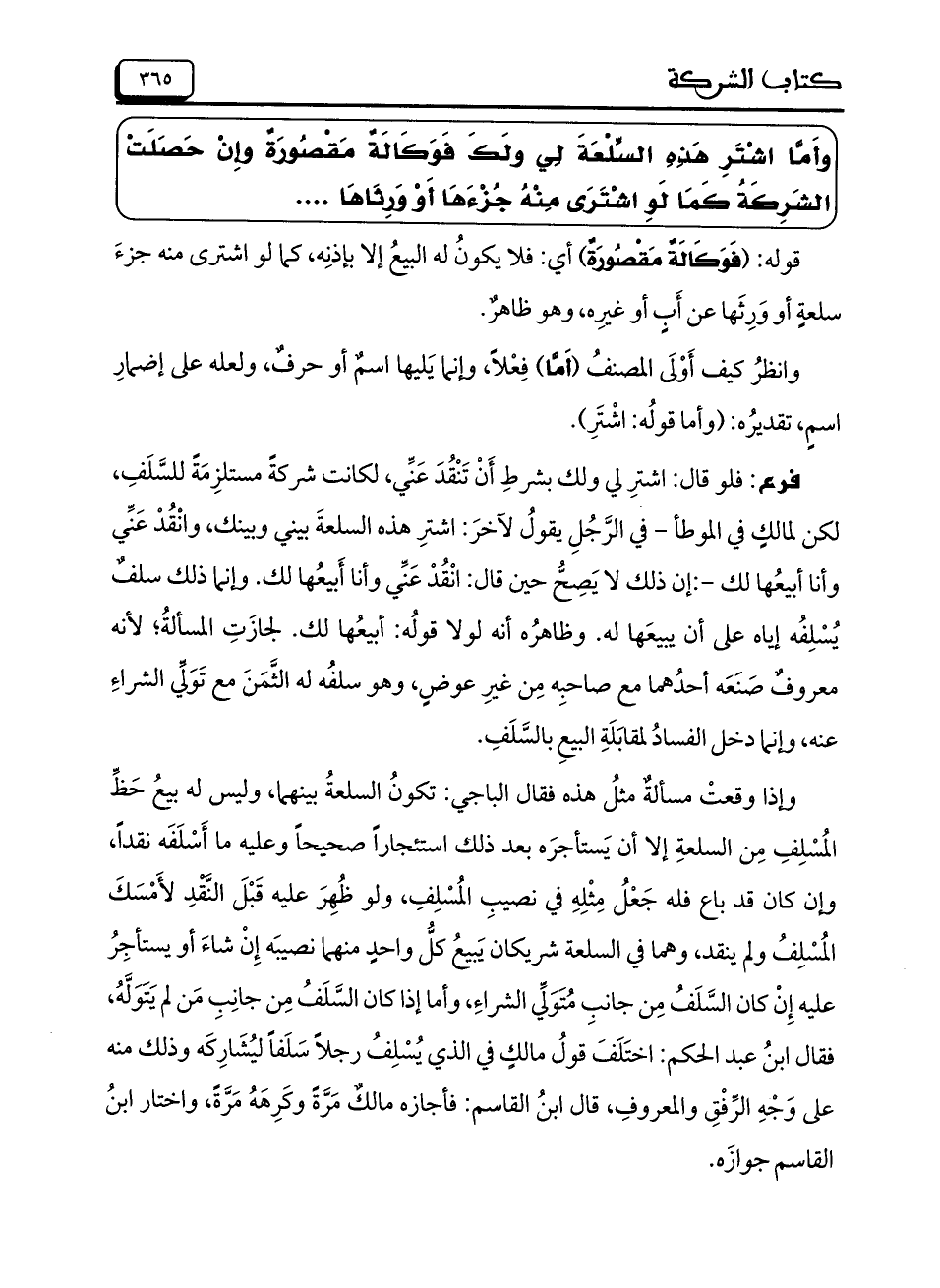 وأَمَّا اشْتَرِ هَذِهِ السِّلْعَةَ لِي ولَكَ فَوَكَالَةٌ مَقْصُورِةٌ وإِنْ حَصَلَتْ الشَرِكَةُ كَمَا لَوِ اشْتَرَى مِنْهُ جُزْءَهَا أَوْ وَرِثَاهَا ....