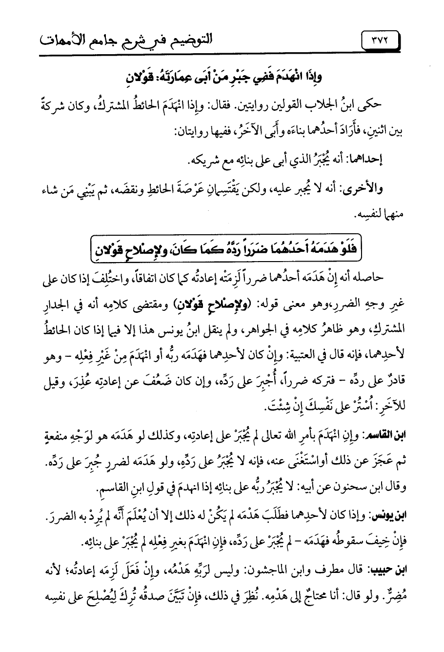 ابن القاسم: وإن انهدم بأمر الله تعالى لم يجبر على إعادته، وكذلك لو هدمه هو لوجه منفعة ثم عجز عن ذلك أو استغنى عنه، فإنه لا يجبر على رده، ولو هدمه لضرر جبر على رده. وقال ابن سحنون عن أبيه: لا يجبر ربه على بنائه إذا انهدم في قول ابن القاسم.