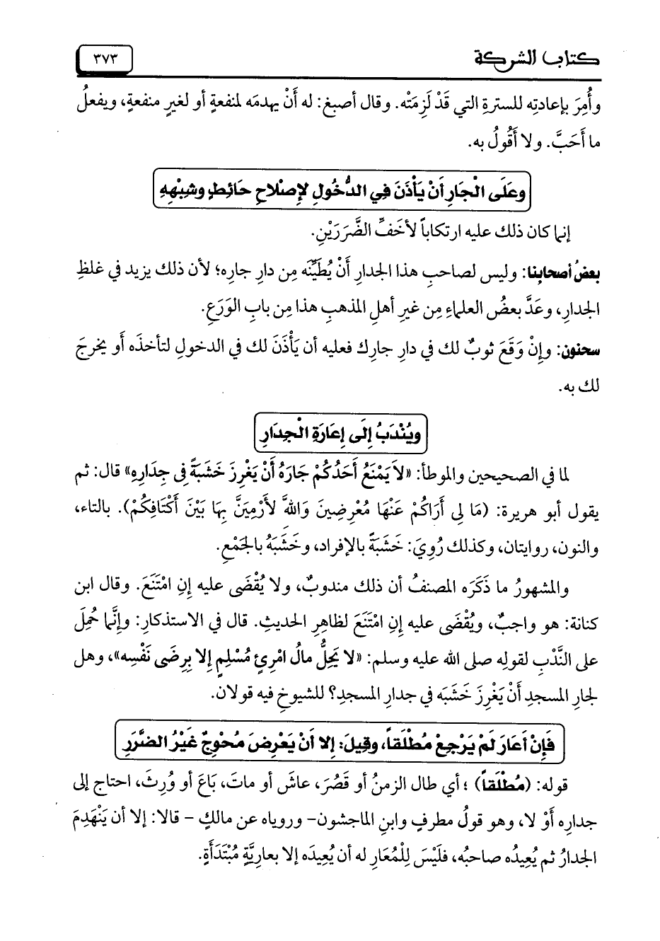 لما في الصحيحين والموطأ: «لا يمنع أحدكم جاره أن يغرز خشبة في جداره» قال: ثم يقول أبو هريرة: (ما لي أراكم عنها معرضين والله لأرمين بها بين أكتافكم). بالتاء، والنون، روايتان، وكذلك روي: خشبة بالإفراد، وخشبه بالجمع.
