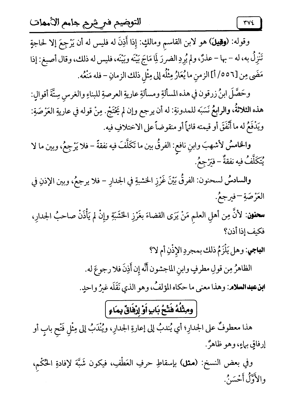 والسادس لسحنون: الفرق بين غرز الخشبة في الجدار - فلا يرجع، وبين الإذن في العرصة - فيرجع.