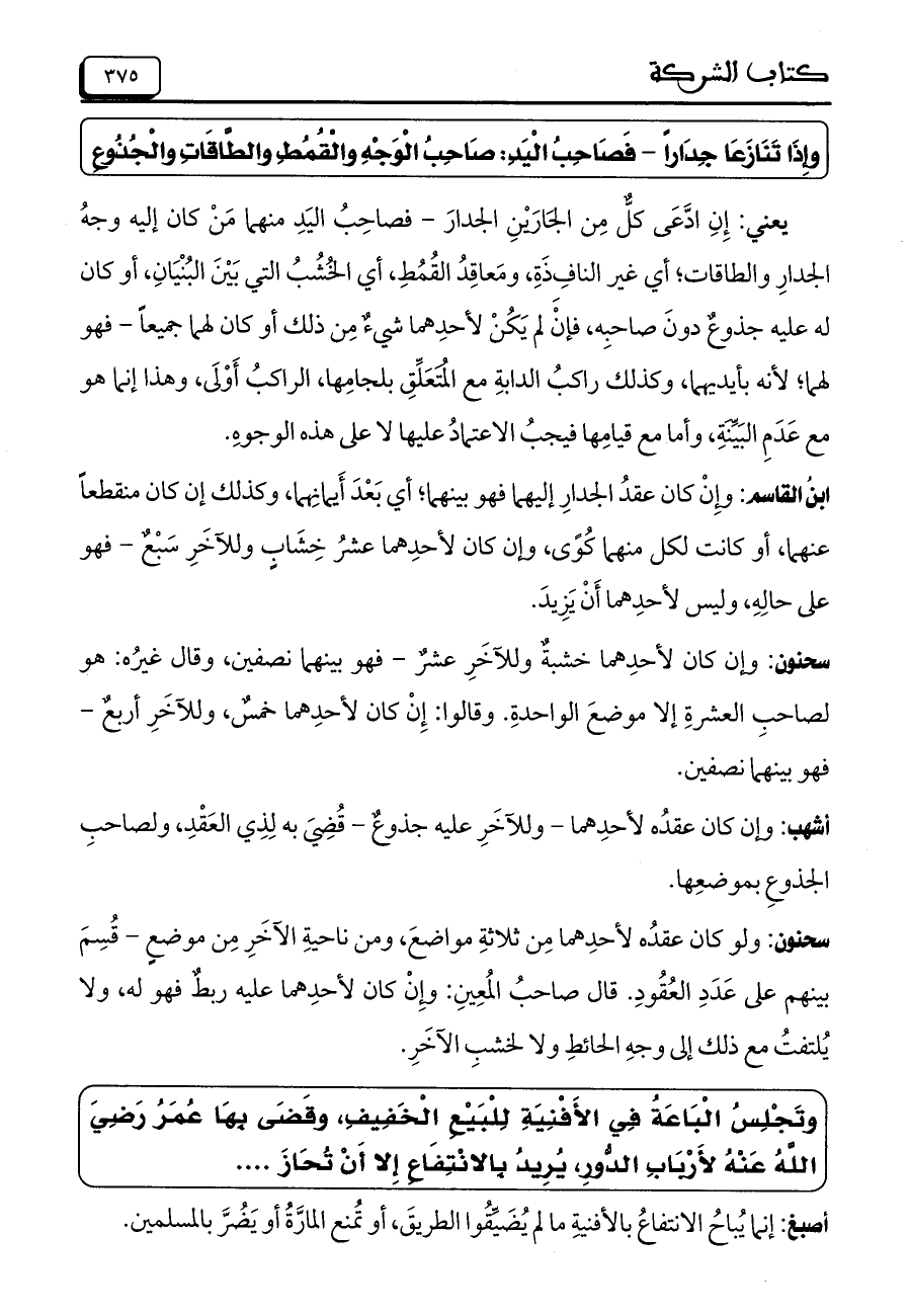 وتَجْلِسُ الْبَاعَةُ فِي الأَفْنِيَةِ لِلْبَيْعِ الْخَفِيفِ، وقَضَى بِهَا عُمَرُ رَضِيَ اللهُ عَنْهُ لأَرْبَابِ الدُّورِ، يُرِيدُ بِالانْتِفَاعِ إِلا أَنْ تُحَازَ ....