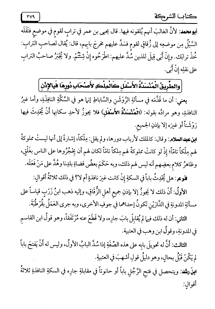 ابن عبد السلام: وقال: كالملك لأرباب دورها، ولم يقل: ملكاً، إشارة إلى أنها ليست مملوكة لهم ملكاً تاماً؛ إذ لو كانت مملوحة لهم ملكاً تاماً لكان لهم أن يحجروه على الناس بغلق، وظاهر كلام بعضهم أنه ليس لهم ذلك، وبه حكم بعض قضاة بلدنا وهد على من فعله.