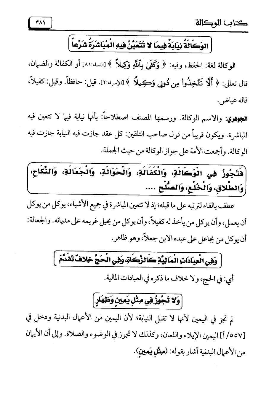 الوَكَالَةُ نِيَابَةٌ فِيمَا لا تَتَعَيَّنُ فِيهِ الْمُبَاشَرَةُ شَرْعاً
