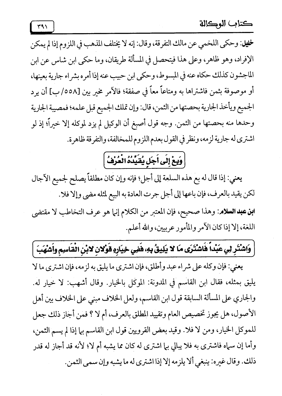 خليل: وحكى اللخمي عن مالك التفرقة، وقال: إنه لا يختلف المذهب في اللزوم إذا لم يمكن الإفراد، وهو ظاهر، وعلى هذا فيتحصل في المسألة طريقان، وما حكى ابن شاس عن ابن الماجشون كذلك حكاه عنه في المبسوط، وحكى ابن حبيب عنه إذا أمره بشراء جارية بعينها، أو موصوفة بثمن فاشتراها به ومتاعاً معاً في صفقة؛ فالآمر مخير بين [558/ب] أن يرد الجميع ويأخذ الجارية بحصتها من الثمن، قال: وإن تملك الجميع قبل علمه؛ فمصيبة الجارية وحدها منه بحصتها من الثمن. وجه قول أصبغ أن الوكيل لم يزد لموكله إلا خيراً؛ إذ لو اشترى له جارية لزمه، ونظر في القول بعدم اللزوم للمخالفة، والتفرقة ظاهرة.