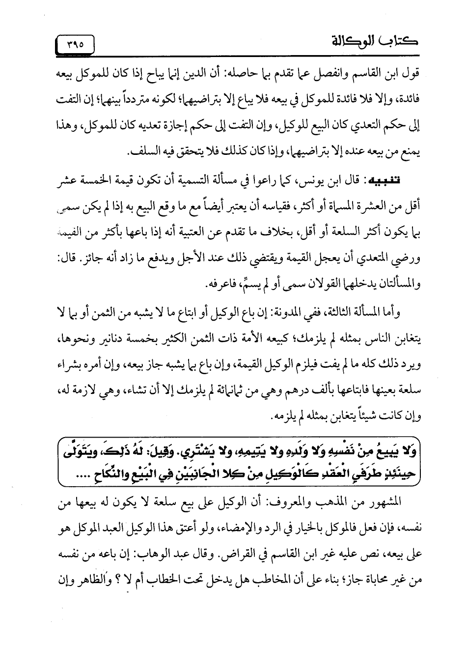 قول ابن القاسم وانفصل عما تقدم بما حاصله: أن الدين إنما يباح إذا كان للموكل بيعه فائدة، وإلا فلا فائدة للموكل في بيعه فلا يباع إلا بتراضيهما؛ لكونه متردداً بينهما؛ إن التفت إلى حكم التعدي كان البيع للوكيل، وإن التفت إلى حكم إجازة تعديه كان للموكل، وهذا يمنع من بيعه عنده إلا بتراضيهما، وإذا كان كذلك فلا يتحقق فيه السلف.