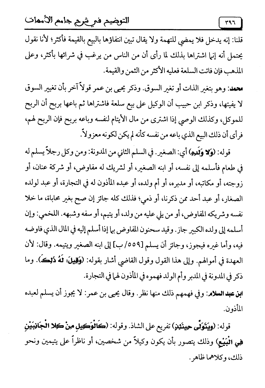قوله: (وَلا وَلَدِهِ) أي: الصغير. في السلم الثاني من المدونة: ومن وكل رجلاً يسلم له في طعام فأسلمه إلى نفسه، أو ابنه الصغير، أو لشريك له مفاوض، أو شركة عنان، أو زوجته، أو مكاتبه، أو مدبره، أو أم ولده، أو عبده المأذون له في التجارة، أو عبد لولده الصغار، أو عبد أحد ممن ذكرنا، أو ذمي؛ فذلك كله جائز إن صح بغير محاباة، ما خلا نفسه وشريكه المفاوض، أو من يلي عليه من ولد، أو يتيم، أو سفه وشبهه. اللخمي: وإن أسلمه إلى ولده الكبير جاز. وقيد سحنون المفاوض بما إذا أسلم إليه في المال الذي فاوضه فيه، وأما غيره فيجوز، وجائز أن يسلم [559/ب] إلى ابنه الصغير ويتيمه. وقال: لأن العهدة في أموالهم. وإلى هذا القول وقول القاضي أشار بقوله: (وَقِيلَ: لَهُ ذَلِكَ). وما ذكر في المدونة في المدبر وأم الولد فهموه في المأذون لهما في التجارة.