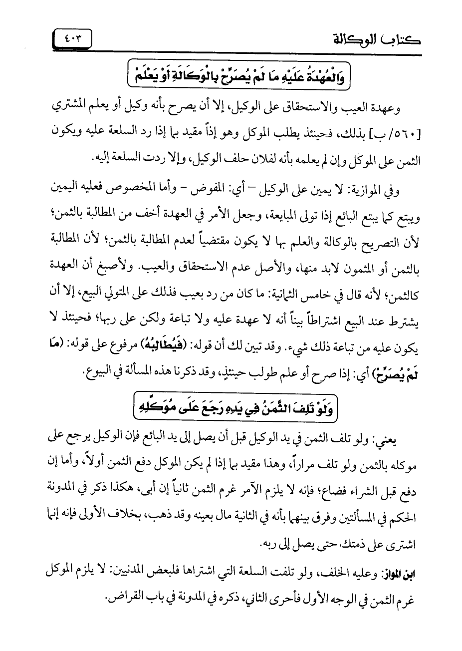 وعهدة العيب والاستحقاق على الوكيل، إلا أن يصرح بأنه وكيل أو يعلم المشتري [560/ب] بذلك، فحينئذ يطلب الموكل وهو إذاً مقيد بما إذا رد السلعة عليه ويكون الثمن على الموكل وإن لم يعلمه بأنه لفلان حلف الوكيل، وإلا ردت السلعة إليه.