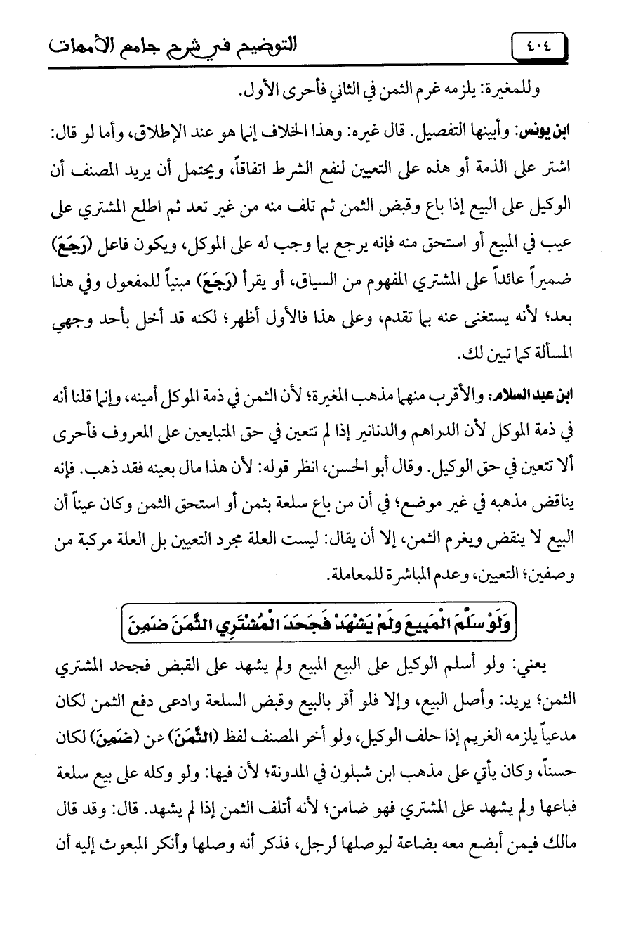 ابن عبد السلام: والأقرب منهما مذهب المغيرة؛ لأن الثمن في ذمة الموكل أمينه، وإنما قلنا أنه في ذمة الموكل لأن الدراهم والدنانير إذا لم تتعين في حق المتبايعين على المعروف فأحرى ألا تتعين في حق الوكيل. وقال أبو الحسن، انظر قوله: لأن هذا مال بعينه فقد ذهب. فإنه يناقض مذهبه في غير موضع؛ في أن من باع سلعة بثمن أو استحق الثمن وكان عيناً أن البيع لا ينقض ويغرم الثمن، إلا أن يقال: ليست العلة مجرد التعيين بل العلة مركبة من وصفين؛ التعيين، وعدم المباشرة للمعاملة.