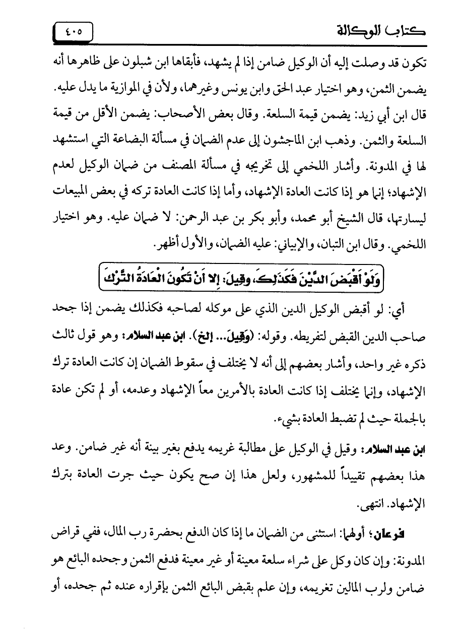 ابن عبد السلام: وقيل في الوكيل على مطالبة غريمه يدفع بغير بينة أنه غير ضامن. وعد هذا بعضهم تقييداً للمشهور، ولعل هذا إن صح يكون حيث جرت العادة بترك الإشهاد. انتهى.