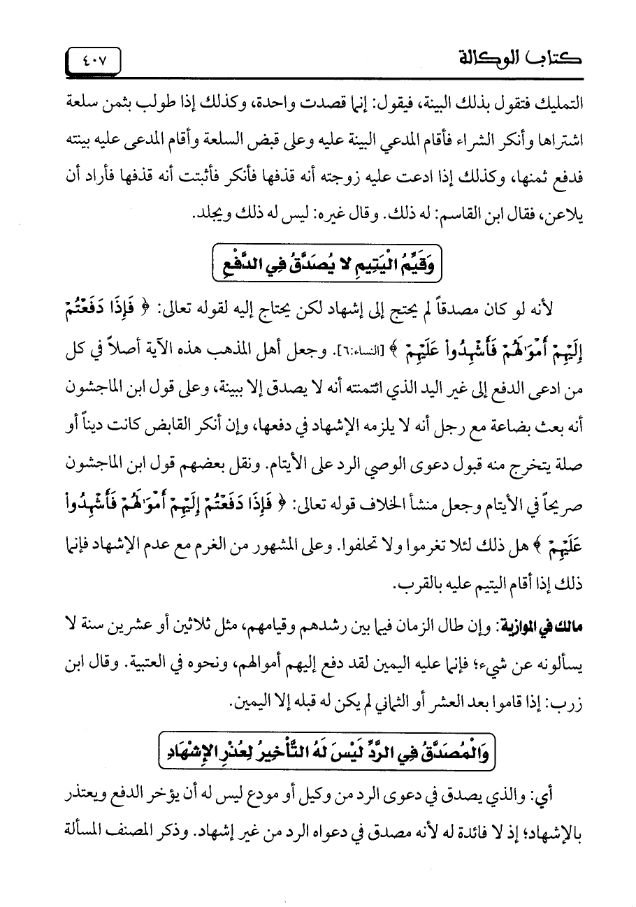 لأنه لو كان مصدقاً لم يحتج إلى إشهاد لكن يحتاج إليه لقوله تعالى: (فَإذَا دَفَعْتُمْ إلَيْهِمْ أَمْوَالَهُمْ فَأَشْهِدُوا عَلَيْهِمْ) [النساء: 6]. وجعل أهل المذهب هذه الآية أصلاً في كل من ادعى الدفع إلى غير اليد الذي ائتمنته أنه لا يصدق إلا ببينة، وعلى قول ابن الماجشون أنه بعث بضاعة مع رجل أنه لا يلزمه الإشهاد في دفعها، وإن أنكر القابض كانت ديناً أو صلة يتخرج منه قبول دعوى الوصي الرد على الأيتام. ونقل بعضهم قول ابن الماجشون صريحاً في الأيتام وجعل منشأ الخلاف قوله تعالى: (فَإذَا دَفَعْتُمْ إلَيْهِمْ أَمْوَالَهُمْ فَأَشْهِدُوا عَلَيْهِمْ) هل ذلك لئلا تغرموا ولا تحلفوا. وعلى المشهور من الغرم مع عدم الإشهاد فإنما ذلك إذا أقام اليتيم عليه بالقرب.
