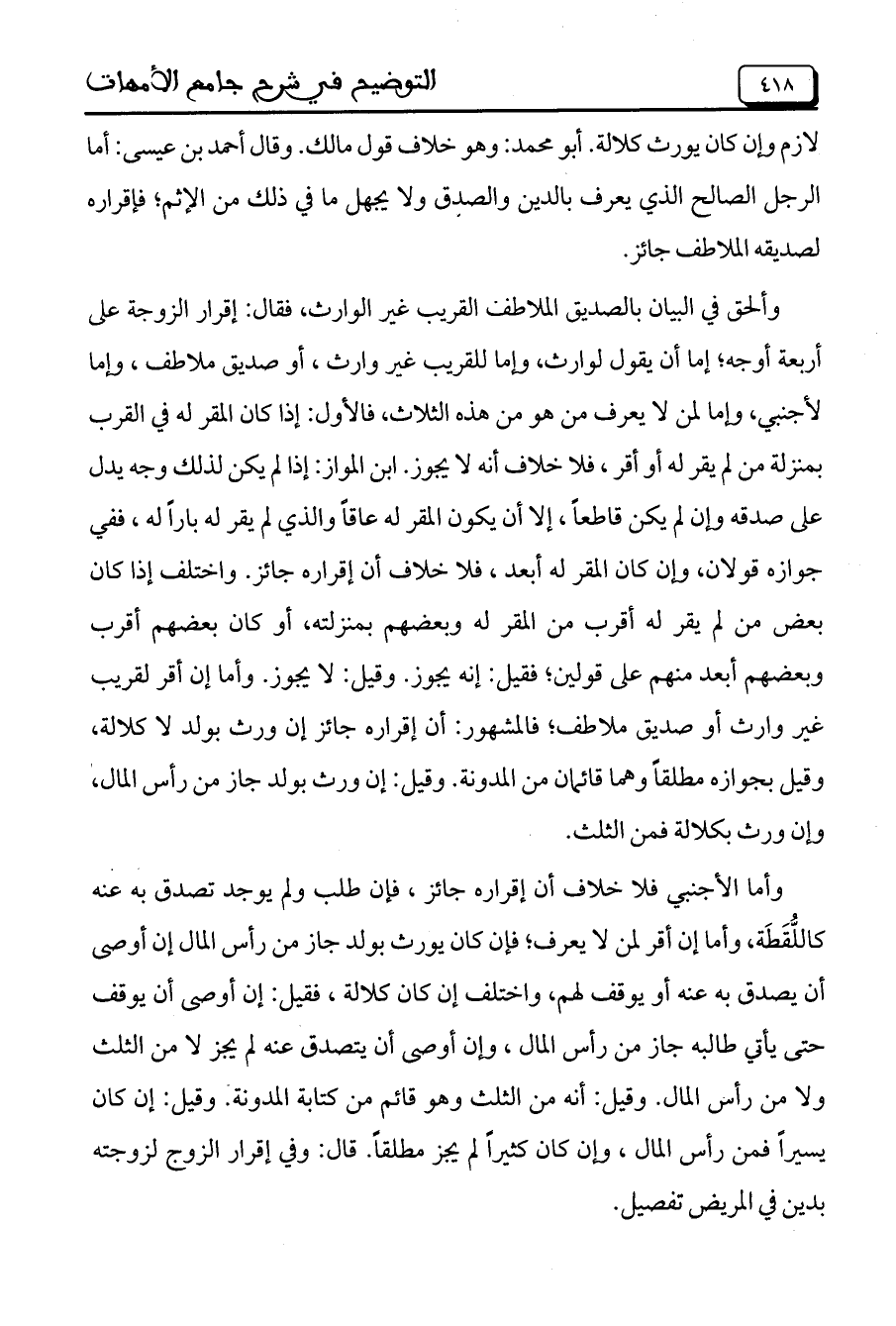 وألحق في البيان بالصديق الملاطف القريب غير الوارث، فقال: إقرار الزوجة على أربعة أوجه؛ إما أن يقول لوارث، وإما للقريب غير وارث، أو صديق ملاطف، وإما لأجنبي، وإما لمن لا يعرف من هو من هذه الثلاث، فالأول: إذا كان المقر له في القرب بمنزلة من لم يقر له أو أقر، فلا خلاف أنه لا يجوز. ابن المواز: إذا لم يكن لذلك وجه يدل على صدقه وإن لم يكن قاطعاً، إلا أن يكون المقر له عاقاً والذي لم يقر له باراً له، ففي جوازه قولان، وإن كان المقر له أبعد، فلا خلاف أن إقراره جائز. واختلف إذا كان بعض من لم يقر له أقرب من المقر له وبعضهم بمنزلته، أو كان بعضهم أقرب وبعضهم أبعد منهم على قولين؛ فقيل: إنه يجوز. وقيل: لا يجوز. وأما إن أقر لقريب غير وارث أو صديق ملاطف؛ فالمشهور: أن إقراره جائز إن ورث بولد لا كلالة، وقيل بجوازه مطلقاً وهما قائمان من المدونة. وقيل: إن ورث بولد جاز من رأس المال، وإن ورث بكلالة فمن الثلث.