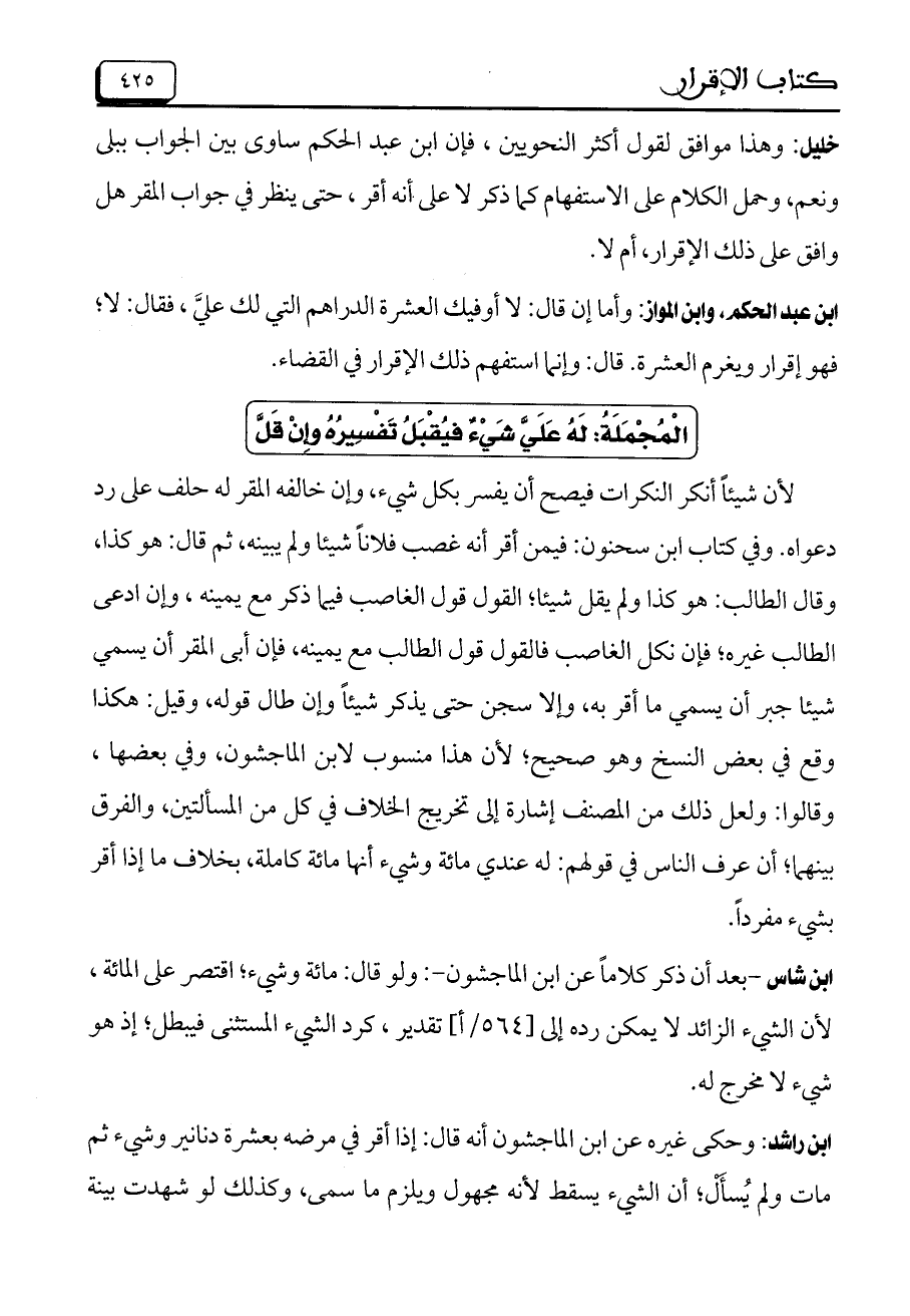 الْمُجْمَلَةُ: لَهُ عَلَيَّ شَيْءٌ فيُقْبَلُ تَفْسِيرُهُ وإِنْ قَلَّ