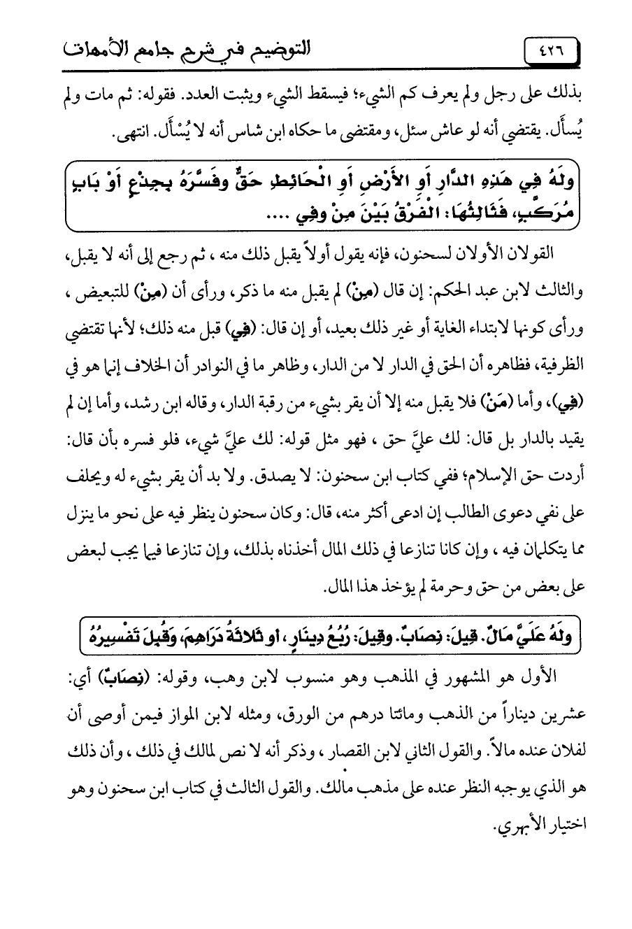 القولان الأولان لسحنون، فإنه يقول أولاً يقبل ذلك منه، ثم رجع إلى أنه لا يقبل، والثالث لابن عبد الحكم: إن قال: (مِنْ) لم يقبل منه ما ذكر، ورأى أن (مِنْ) للتبعيض، ورأى كونها لابتداء الغاية أو غير ذلك بعيد، أو إن قال: (فِي) قبل منه ذلك؛ لأنها تقتضي الظرفية، فظاهره أن الحق في الدار لا من الدار، وظاهر ما في النوادر أن الخلاف إنما هو في (فِي) وأم (مَنْ) فلا يقبل منه إلا أن يقر بشيء من رقبة الدار، وقاله ابن رشد، وأما إن لم يقيد بالدار بل قال: لك عليَّ حق، فهو مثل قوله: لك عليَّ شيء، فلو فسره بأن قال: أردت حق الإسلام؛ ففي كتاب ابن سحنون: لا يصدق. ولا بد أن يقر بشيء له ويحلف على نفي دعوى الطالب إن ادعى أكثر منه، قال: وكان سحنون ينظر فيه على نحو ما ينزل مما يتكلمان فيه، وإن كانا تنازعا في ذلك المال أخذناه بذلك، وإن تنازعا فيما يجب لبعض على بعض من حق وحرمة لم يؤخذ هذا المال.