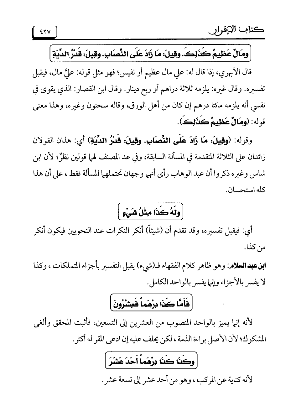 ابن عبد السلام: وهو ظاهر كلام الفقهاء فـ (شيء) يقبل التفسير بأجزاء المتملكات، وكذا لا يفسر بالأجزاء وإنما يفسر بالواحد الكامل.