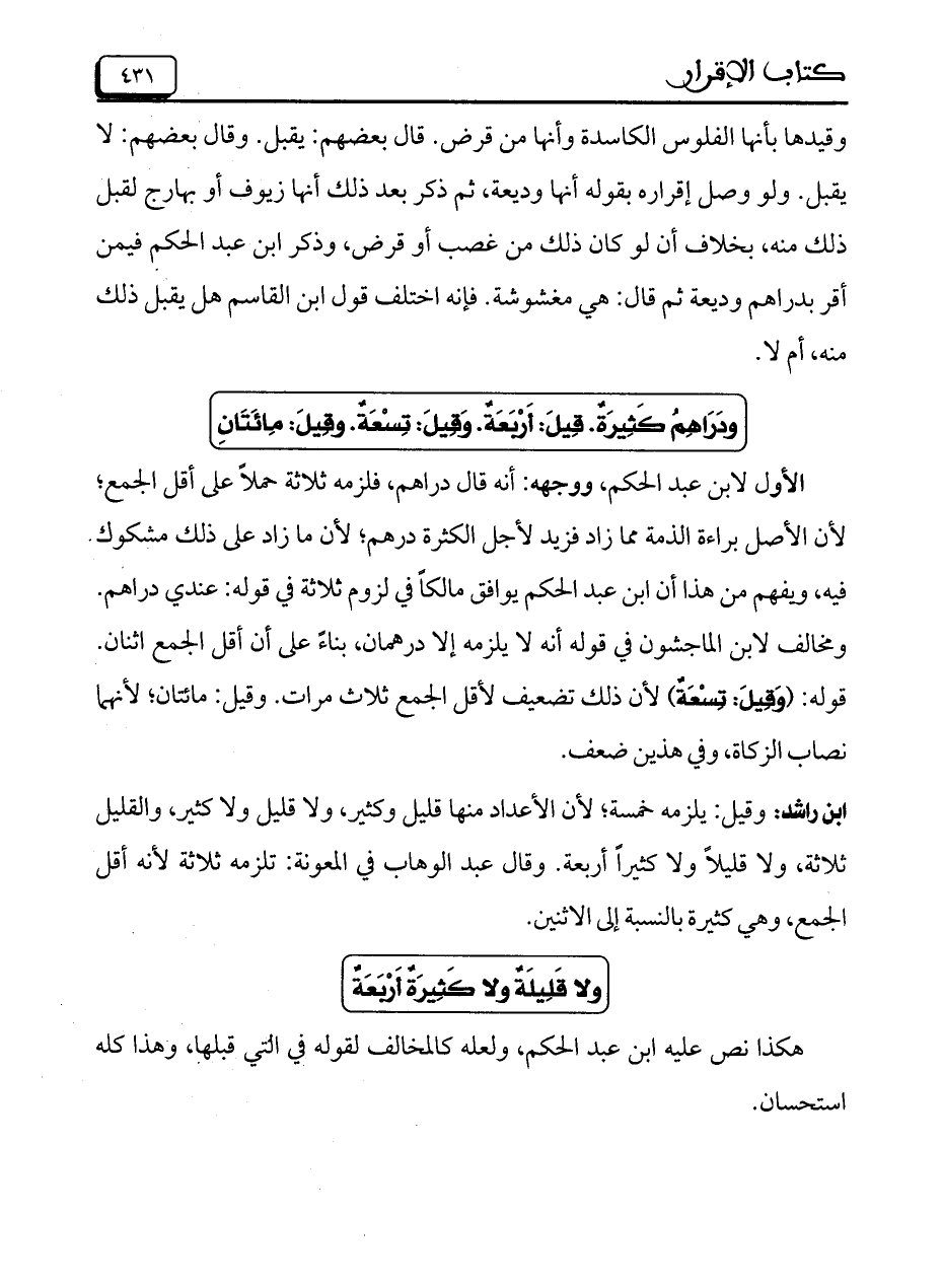 ابن راشد: وقيل: يلزمه خمسة؛ لأن الأعداد منها قليل وكثير، ولا قليل ولا كثير، والقليل ثلاثة، ولا قليلاً ولا كثيراً أربعة. وقال عبد الوهاب في المعونة: تلزمه ثلاثة لأنه أقل الجمع، وهي كثيرة بالنسبة إلى الإثنين.