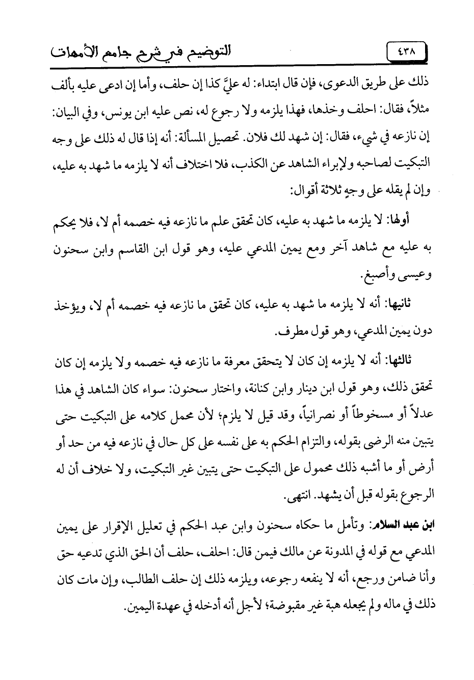 ابن عبد السلام: وتأمل ما حكاه سحنون وابن عبد الحكم في تعليل الإقرار على يمين المدعي مع قوله في المدونة عن مالك فيمن قال: احلف، حلف أن الحق الذي تدعيه حق وأنا ضامن ورجع، أنه لا ينفعه رجوعه، ويلزمه ذلك إن حلف الطالب، وإن مات كان ذلك في ماله ولم يجعله هبة غير مقبوضة؛ لأجل أنه أدخله في عهدة اليمين.