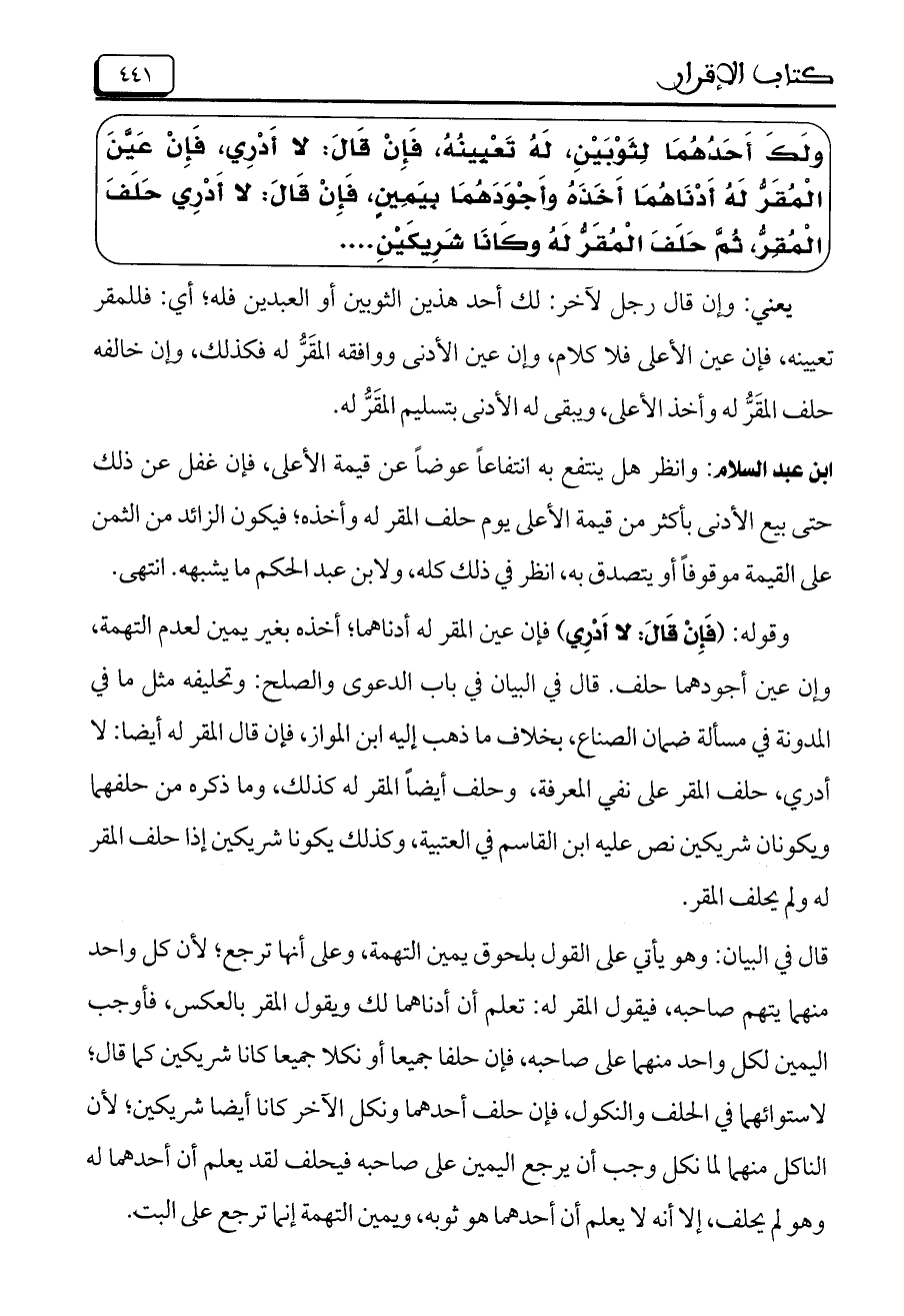 ولَكَ أَحَدُهُمَا لِثَوْبَيْنِ، لَهُ تَعْيينُهُ، فَإِنْ قَالَ: لا أَدْرِي، فَإِنْ عَيَّنَ الْمُقَرُّ لَهُ أَدْنَاهُمَا أَخَذَهُ وأَجْوَدَهُمَا بِيَمِينٍ، فَإِنْ قَالَ: لا أَدْري حَلَفَ الْمُقِرُّ، ثُمَّ حَلَفَ الْمُقَرُّ لَهُ وكَانَا شَرِيكَيْنِ ....