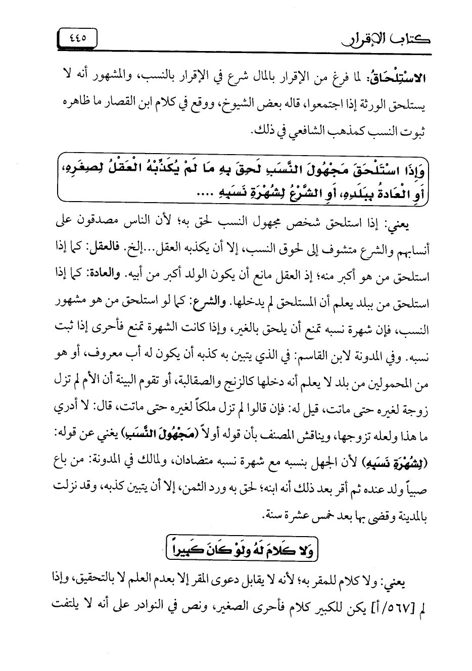 الاستلحاق: لما فرغ من الإقرار بالمال شرع في الإقرار بالنسب، والمشهور أنه لا يستلحق الورثة إذا اجتمعوا، قاله بعض الشيوخ، ووقع في كلام ابن القصار ما ظاهره ثبوت النسب كمذهب الشافعي في ذلك.