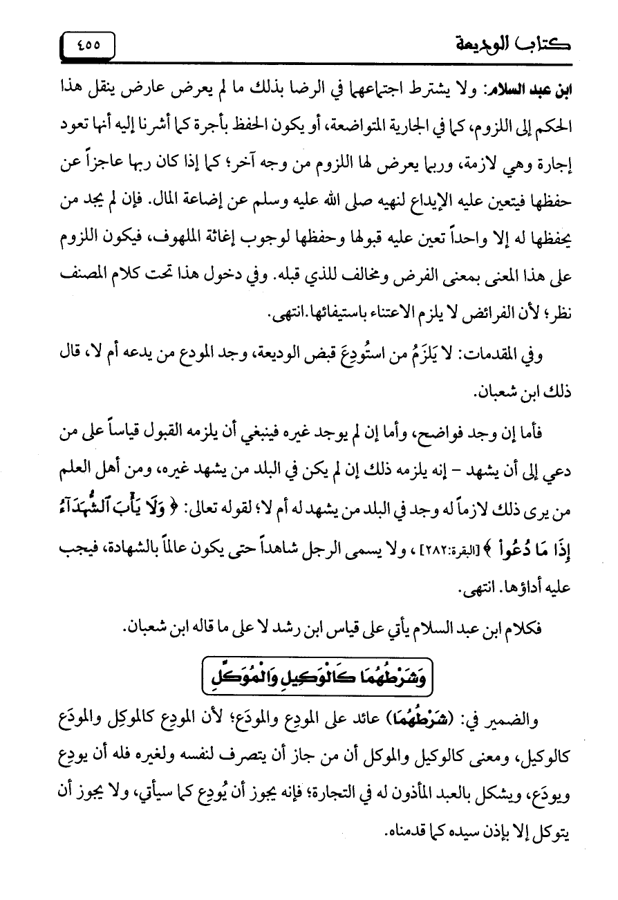 ابن عبد السلام: ولا يشترط اجتماعهما في الرضا بذلك ما لم يعرض عارض ينقل هذا الحكم إلى اللزوم، كما في الجارية المتواضعة، أو يكون الحفظ بأجرة كما أشرنا إليه أنها تعود إجارة وهي لازمة، وربما يعرض لها اللزوم من وجه آخر؛ كما إذا كان ربها عاجزاً عن حفظها فيتعين عليه الإيداع لنهيه صلى الله عليه وسلم عن إضاعة المال. فإن لم يجد من يحفظها له إلا واحداً تعين عليه قبولها وحفظها لوجوب إغاثة الملهوف، فيكون اللزوم على هذا المعنى بمعنى الفرض ومخالف للذي قبله. وفي دخول هذا تحت كلام المصنف نظر؛ لأن الفرائض لا يلزم الاعتناء باستيفائها. انتهى.