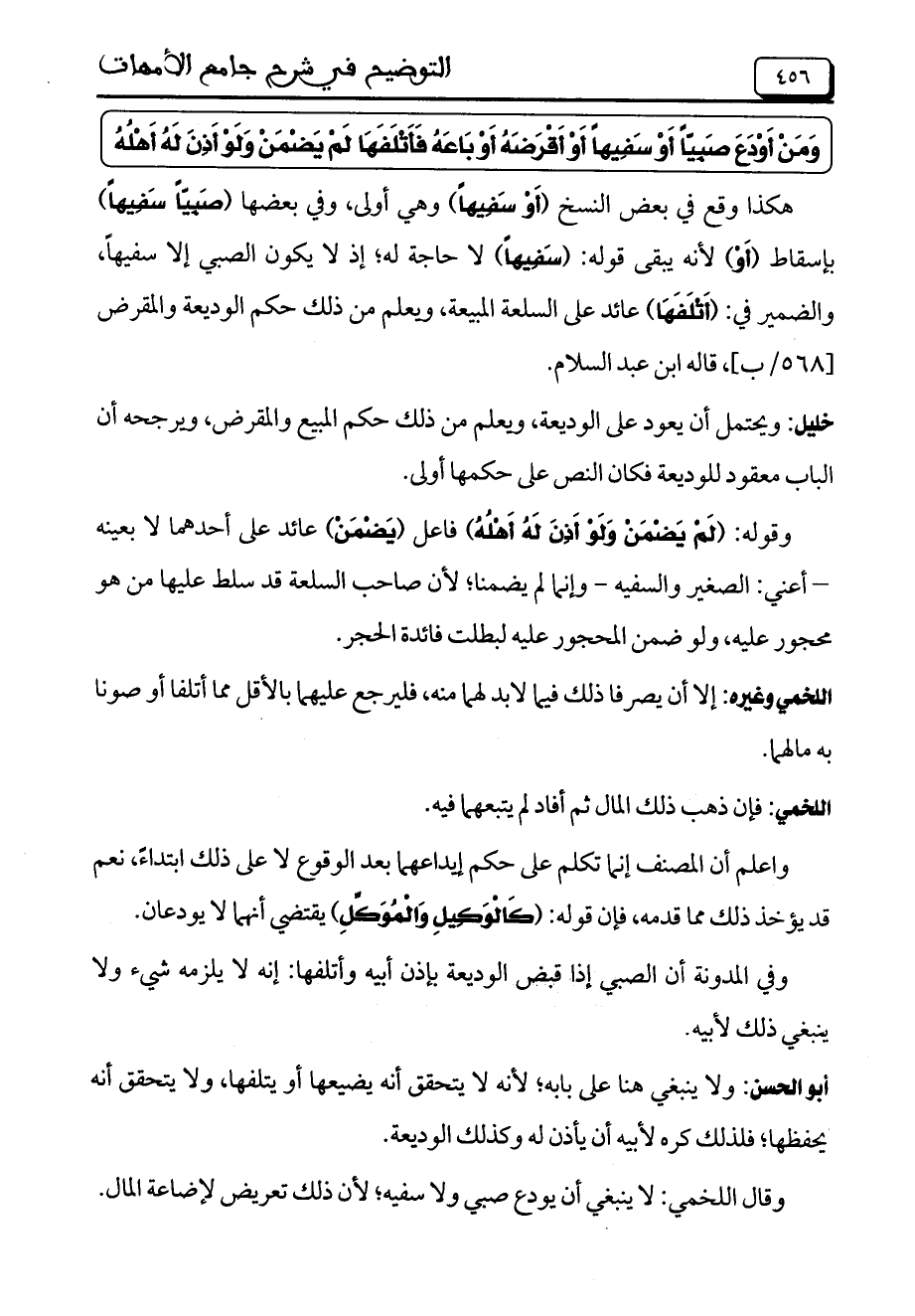 هكذا وقع في بعض النسخ (أَوْ سَفِيْهاً) وهي أولى، وفي بعضها (صَبِيَّاً سَفِيْهاً) بإسقاط (أَوْ) لأنه يبقى قوله: (سَفِيْهاً) لا حاجة له؛ إذ لا يكون الصبي إلا سفيهاً، والضمير في: (أَتْلَفَهَا) عائد على السلعة المبيعة، ويعلم من ذلك حكم الوديعة والمقرض [568/ب]، قاله ابن عبد السلام.