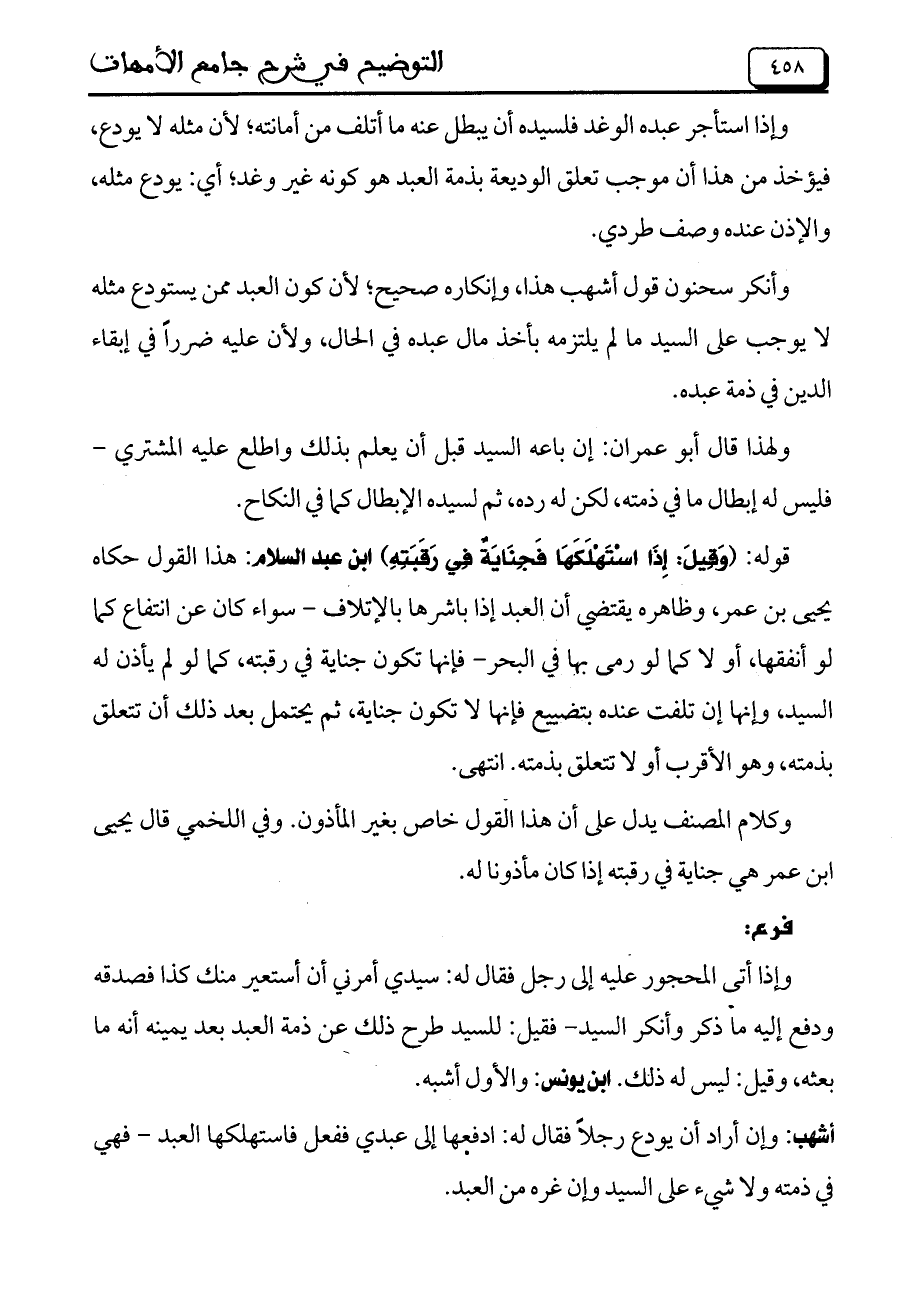 وأنكر سحنون قول أشهب هذا، وإنكاره صحيح؛ لأن كون العبد ممن يستودع مثله لا يوجب على السيد ما لم يلتزمه بأخذ مال عبده في الحال، ولأن عليه ضرراً في إبقاء الدين في ذمة عبده.