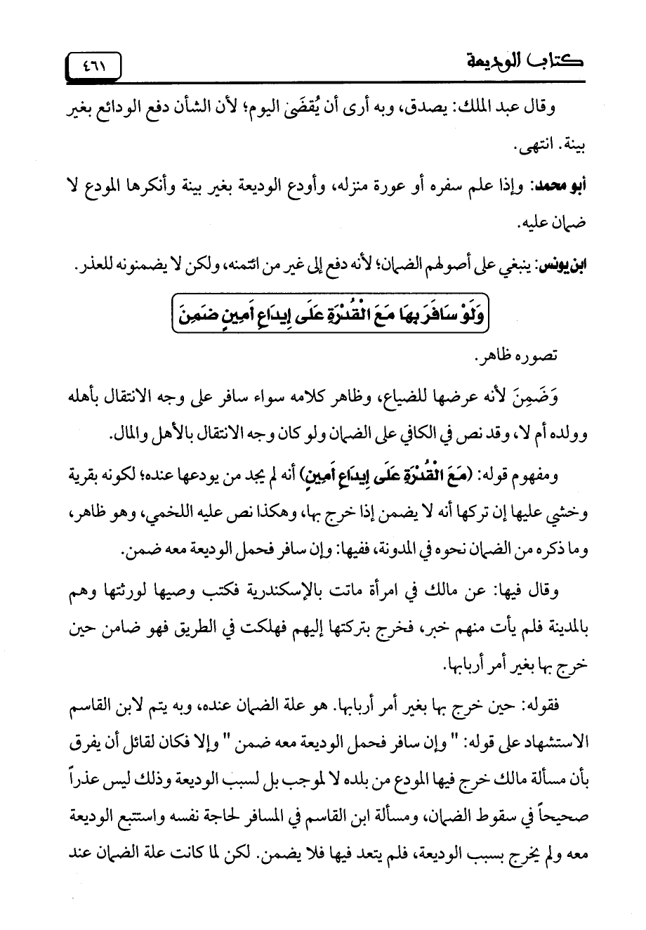 فقوله: حين خرج بها بغير أم أربابها. هو علة الضمان عنده، وبه يتم لابن القاسم الاستشهاد على قوله: "وإن سافر فحمل الوديعة معه ضمن" وغلا فكان لقائل أن يفرق بأن مسألة مالك خرج فيها المودع من بلده لا لموجب بل لسبب الوديعة وذلك ليس عذراً صحيحاً في سقوط الضمان، ومسألة ابن القاسم في المسافر لحاجة نفسه واستتبع الوديعة معه ولم يخرج بسبب الوديعة، فلم يتعد فيها فلا يضمن. لكن لما كانت علة الضمان عند