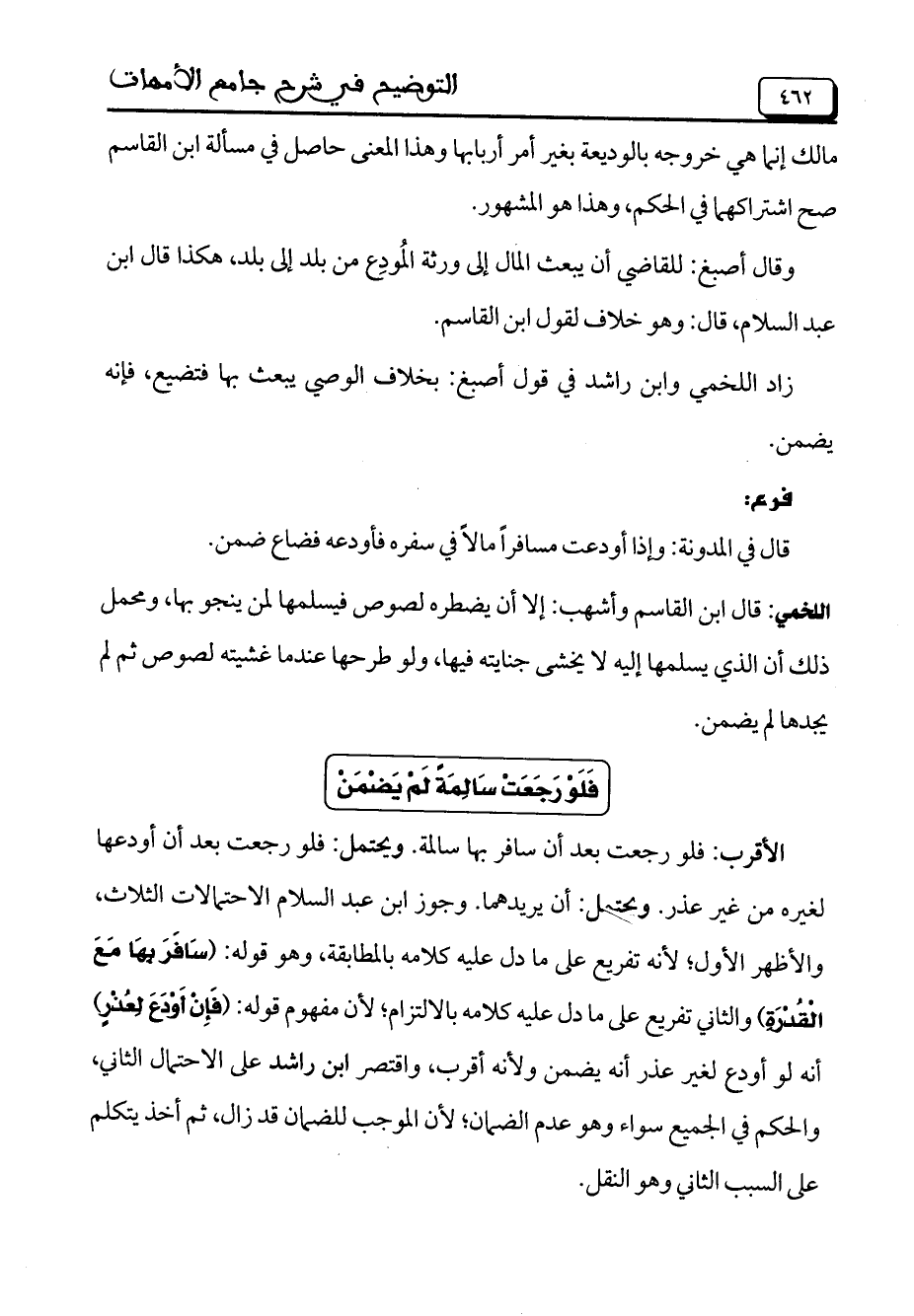 الأقرب: فلو رجعت بعد أن سافر بها سالمة. ويحتمل: فلو رجعت بعد أن أودعها لغيره من غير عذر. ويحتمل: أن يريدهما. وجوز ابن عبد السلام الاحتمالات الثلاث، والأظهر الأول؛ لأنه تفريع على ما دل عليه كلامه بالمطابقة، وهو قوله: (سَافَرَ بِهَا مَعَ الْقُدْرَةِ) والثاني تفريع على ما دل عليه كلامه بالالتزام؛ لأن مفهوم قوله: (فَإِنْ أَوْدَعَ لِعُذْرٍ) أنه لو أودع لغير عذر أنه يضمن ولأنه أقرب، واقتصر ابن راشد على الاحتمال الثاني، والحكم في الجميع سواء وهو عدم الضمان؛ لأن الموجب للضمان قد زال، ثم أخذ يتكلم على السبب الثاني وهو النقل.