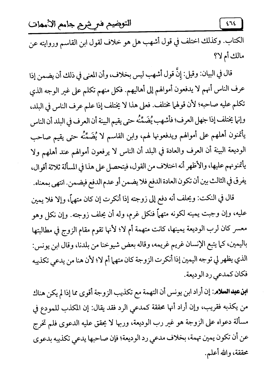 ابن عبد السلام: إن أراد ابن يونس أن التهمة مع تكذيب الزوجة أقوى مما إذا لم يكن هناك من يكذبه فقريب، وإن أراد أنها محققة كمدعي الرد فقد يقال: إن المكذب للمودع في مسألة دعواه على الزوجة هو غير رب الوديعة، وربها لا يحقق عليه الدعوى فلم تخرج عن أن تكون يمين تهمة، بخلاف مدعي رد الوديعة؛ فإن صاحبها يدعي تكذيبه بدعوى محققة، والله أعلم.