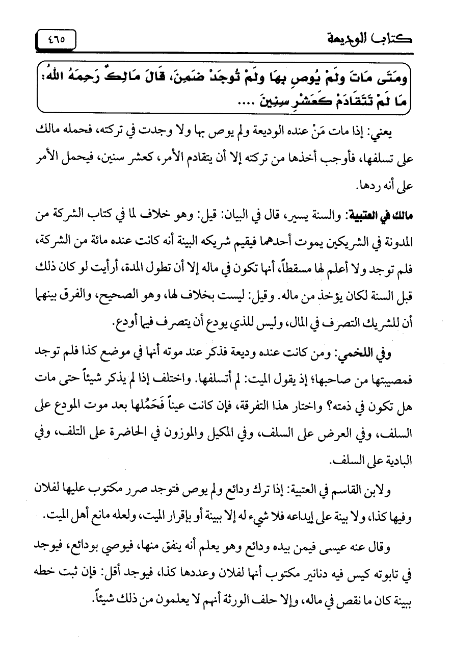 ومَتَى مَاتَ ولَمْ يُوصِ بِهَا ولَمْ تُوْجَدْ ضَمِنَ، قَالَ مَالِكٌ رَحِمَهُ اللهُ: مَا لَمْ تَتَقَادَمْ كَعَشْرِ سِنِينَ ....