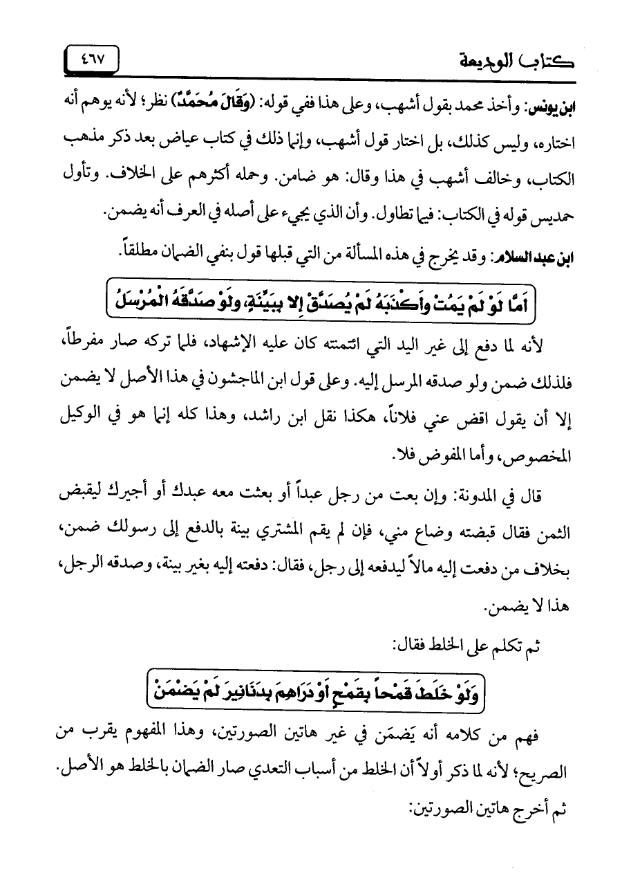 ابن عبد السلام: وقد يخرج في هذه المسألة من التي قبلها قول بنفي الضمان مطلقاً.