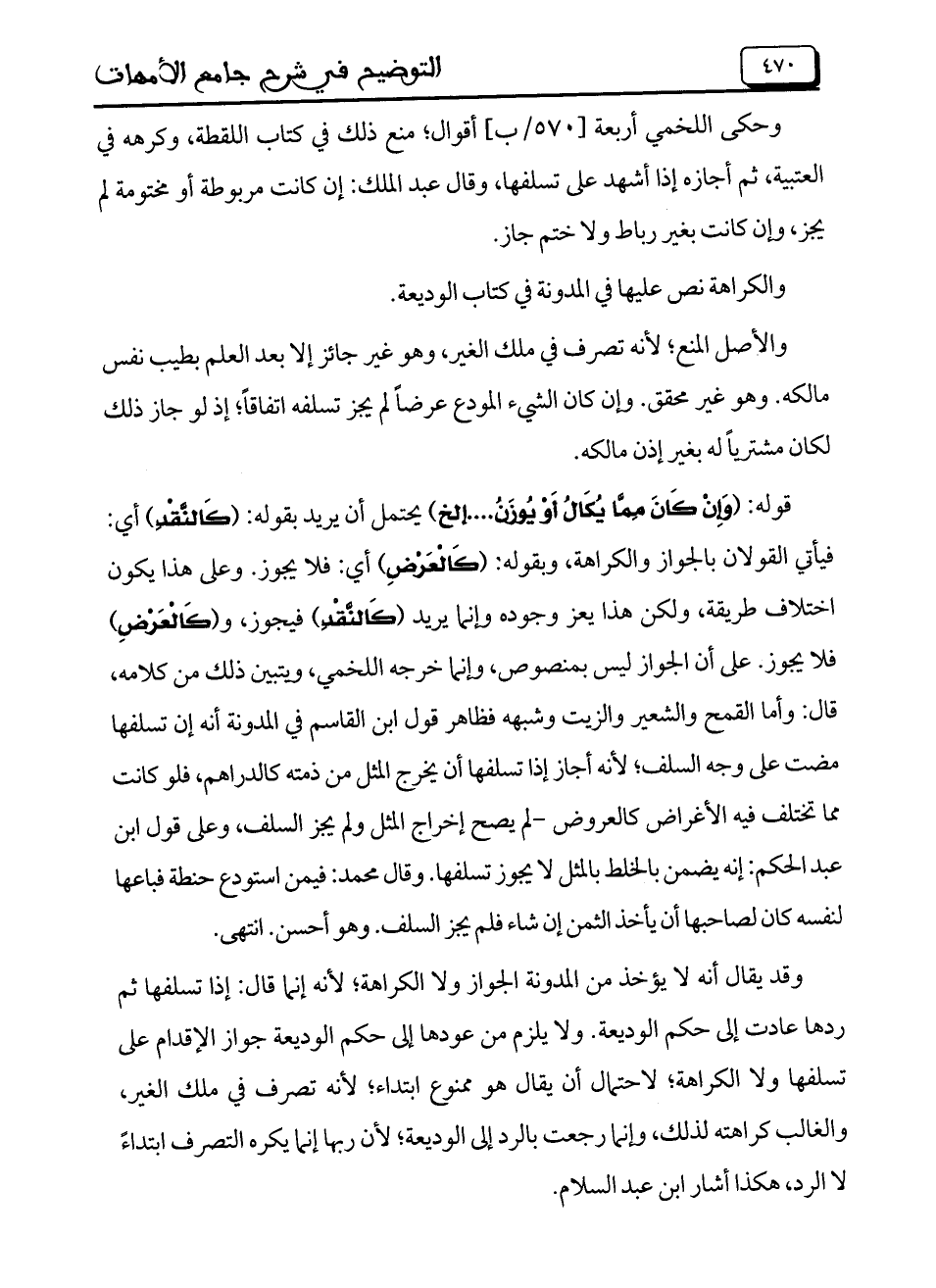 والأصل المنع؛ لأنه تصرف في ملك الغير، وهو غير جائز إلا بعد العلم بطيب نفس مالكه. وهو غير محقق. وإن كان الشيء المودع عرضاً لم يجز تسلفه اتفاقاً؛ إذ لو جاز ذلك لكان مشترياً له بغير إذن مالكه.
