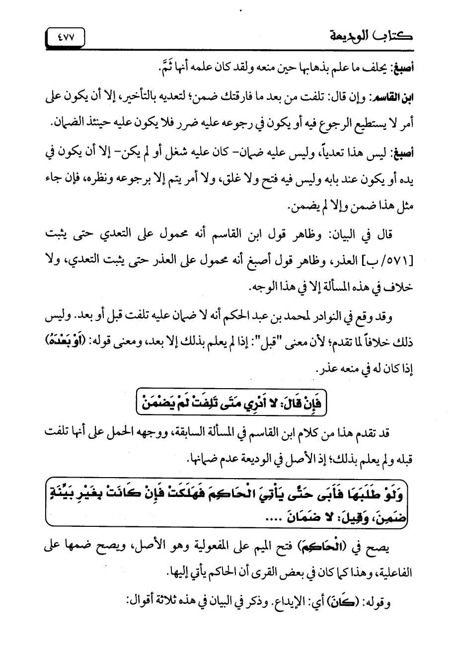 وق وقع في النوادر لمحمد بن عبد الحكم أنه لا ضمان عليه تلفت قبل أو بعد. وليس ذلك خلافاً لما تقدم؛ لأن معنى "قبل": إذا لم يعلم بذلك إلا بعد، ومعنى قوله: (أَوْ بَعْدَهُ) إذا كان له في منعه عذر.