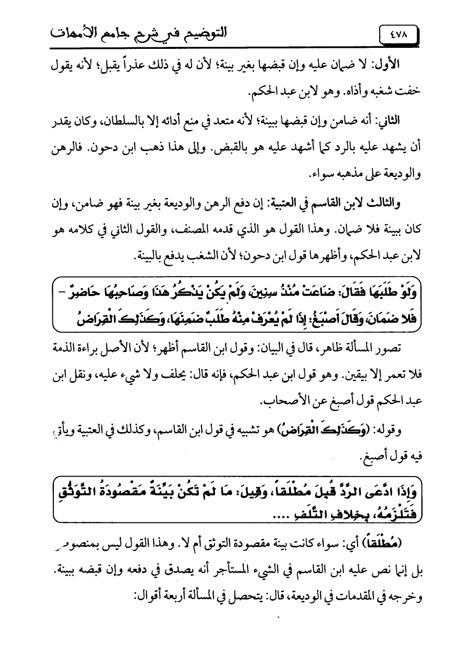 والثالث لابن القاسم في العتبية: إن دفع الرهن والوديعة بغير بينة فهو ضامن، وإن كان ببينة فلا ضمان. وهذا القول هو الذي قدمه المصنف، والقول الثاني في كلامه هو لابن عبد الحكم، وأظهرها قول ابن دحون؛ لأن الشغب يدفع بالبينة.