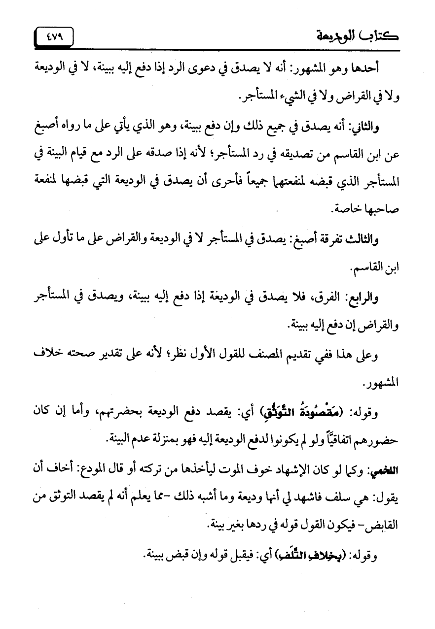 اللخمي: وكما لو كان الإشهاد خوف الموت ليأخذها من تركته أو قال المودع: أخاف أن يقول: هي سلف فاشهد لي أنها وديعة وما أشبه ذلك - مما يعلم أنه لم يقصد التوثق من القابض - فيكون القول قوله في ردها بغير بينة.