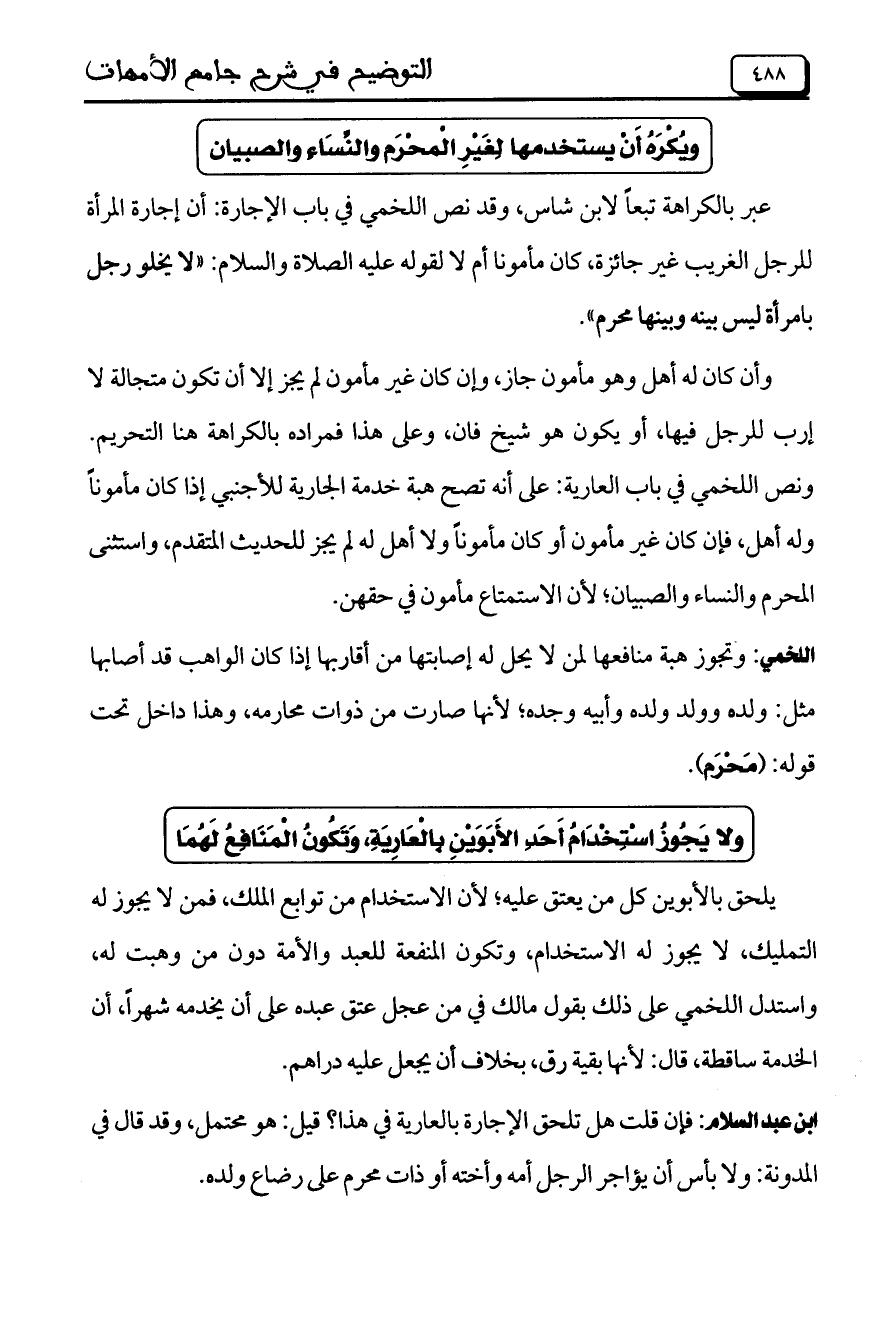 ابن عبد السلام: فإن قلت هذ تلحق الإجارة بالعارية في هذا؟ قيل: هو محتمل، وقد قال في المدونة: ولا بأس أن يؤاجر الرجل أمه وأخته أو ذات محرم على رضاع ولده.