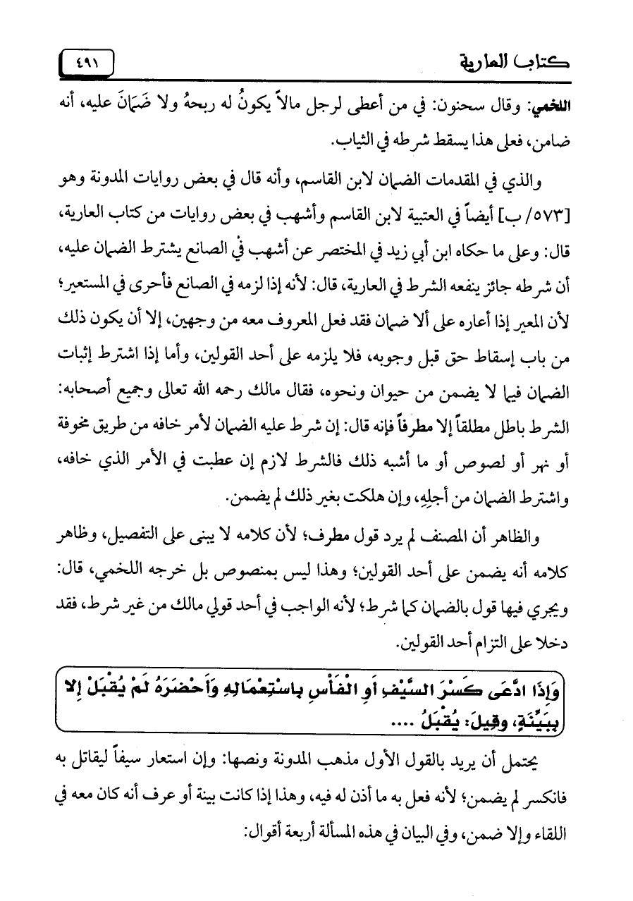 اللخمي: وقال سحنون: في من أعطى لرجل مالاً يكونُ له ربحهُ ولا ضَمَانَ عليه، أنه ضامن، فعلى هذا يسقط شرطه في الثياب.