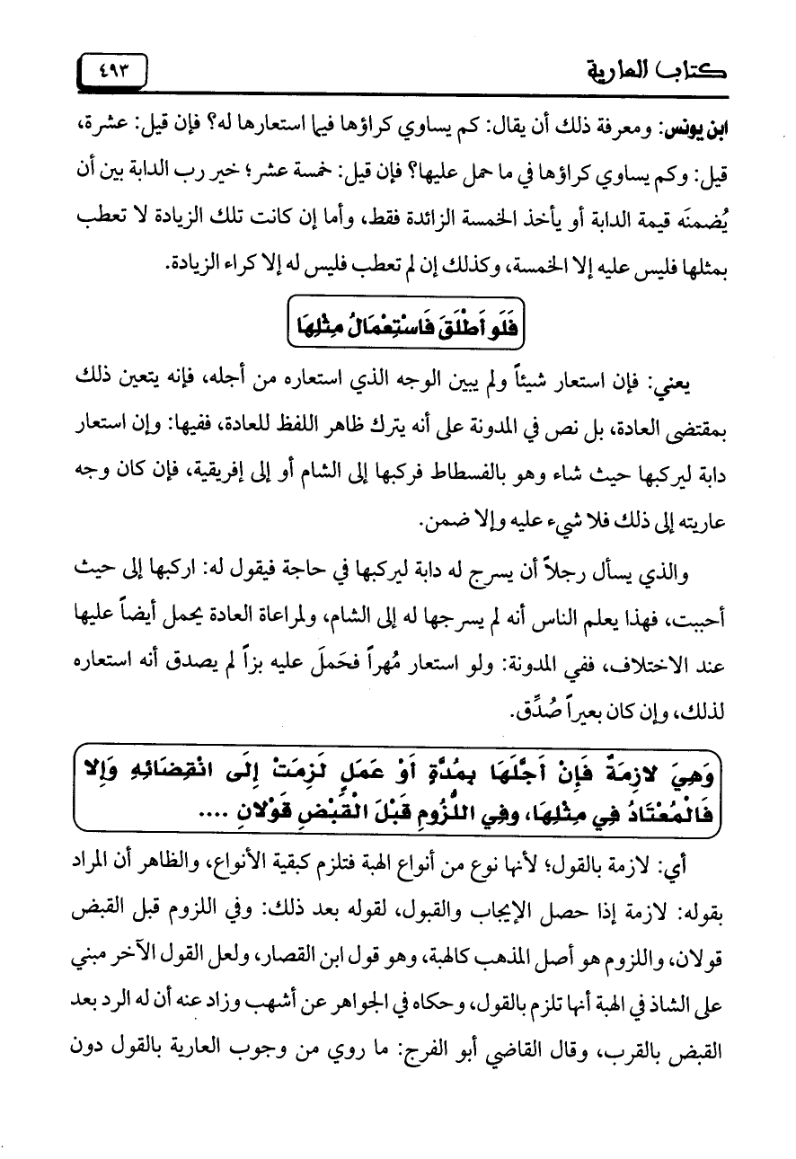ابن يونس: ومعرفة ذلك أن يقال: كم يساوي كراؤها فيما استعارها له؟ فإن قيل: عشرة، قيل: وكم يساوي كراؤها في ما حمل عليها؟ فإن قيل: خمسة عشر؛ خير رب الدابة بين أن يُضمنَه قيمة الدابة أو يأخذ الخمسة الزائدة فقط، وأما إن كانت تلك الزيادة لا تعطب بمثلها فليس عليه إلا الخمسة، وكذلك إن لم تعطب فليس له إلا كراء الزيادة.