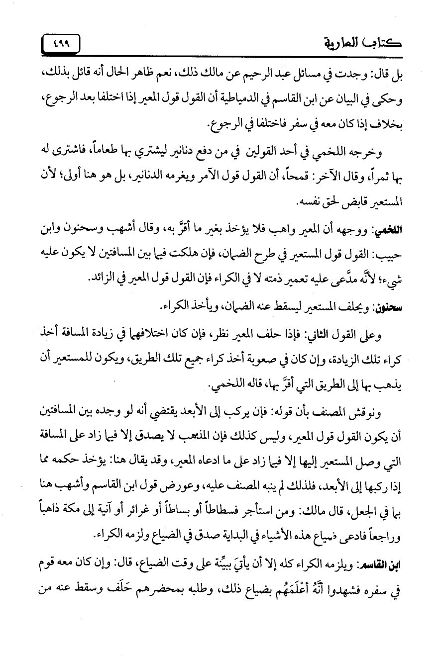 بل قال: وجدت في مسائل عبد الرحيم عن مالك ذلك، نعم ظاهر الحال أنه قائل بذلك، وحكى في البيان عن ابن القاسم في الدمياطية أن القول قول المعير إذا اختلفا بعد الرجوع، بخلاف إذا كان معه في سفر فاختلفا في الرجوع.