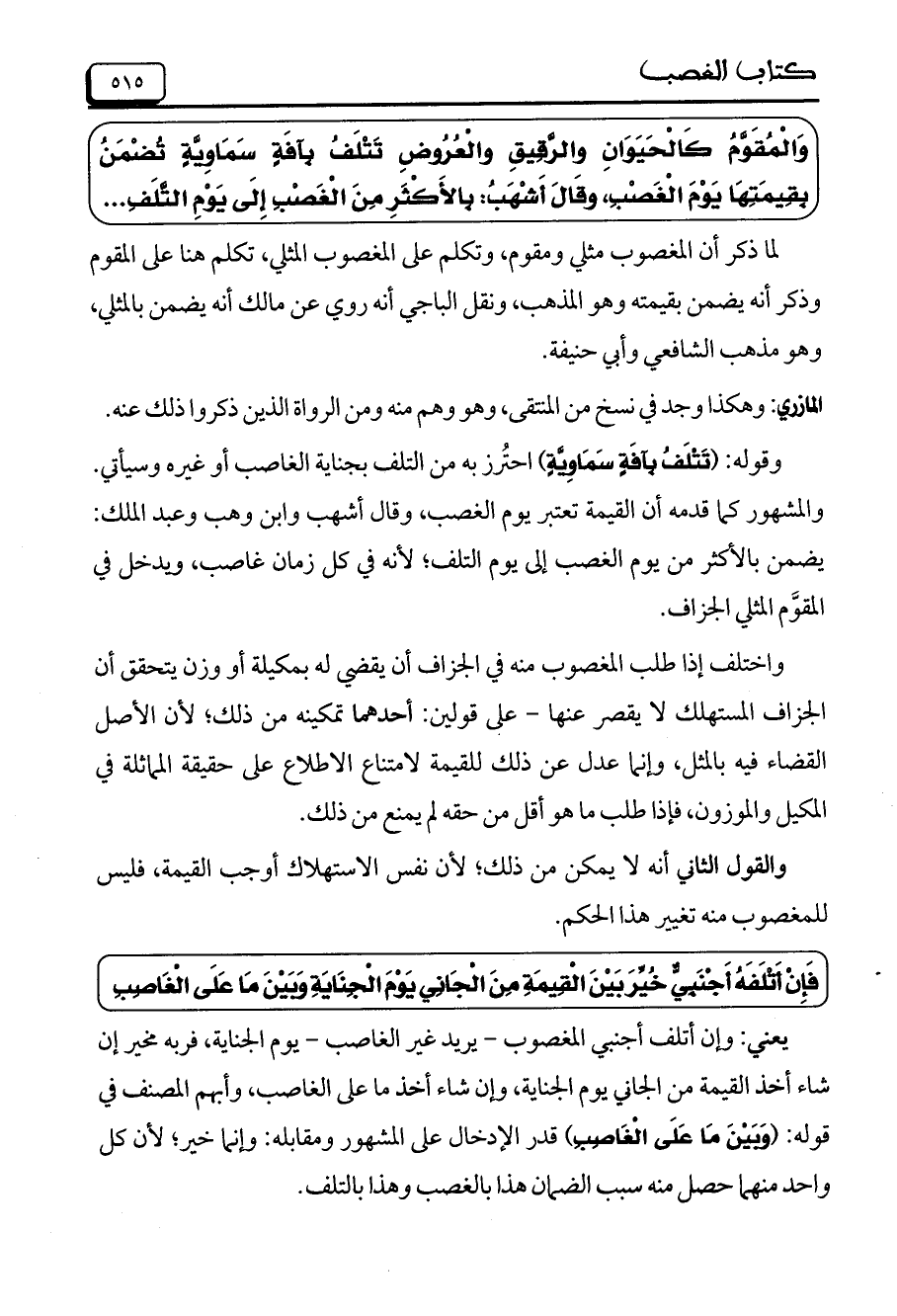 وَالْمُقَوَّمُ كَالْحَيَوَانِ والرَّقِيقِ والْعُرُوضِ تَتْلَفُ بِآفَةٍ سَمَاويَّةٍ تُضْمَنُ بِقِيمَتِهَا يَوْمَ الْغَصْبِ، وقَالَ أَشْهَبُ: بِالأَكْثَرِ مِنَ الْغَصْبِ إِلى يَوْمِ التَّلَفِ ...
